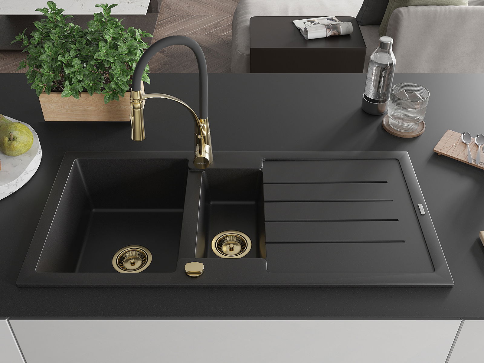 Mexen Andres Granit-Spullbak mat 1,5-Kummer mat Drëchentraeger an Kichendëpp Aster, schwaarz - 6515-77-73450-57-G