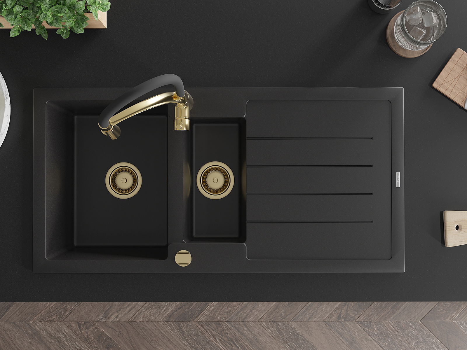 Den Spullsteen huet 2 virberäitet Lächer mat engem Duerchmiesser vun 35 mm, déi selbststänneg ausgeschloen kënne ginn. Se kënne fir d'Montage vun engem Flëssegkeetsspender benotzt ginn, deen d'Präsenz vu Plastikfläschen an der Kichen eliminéiert an hir en elegant Finish gëtt.