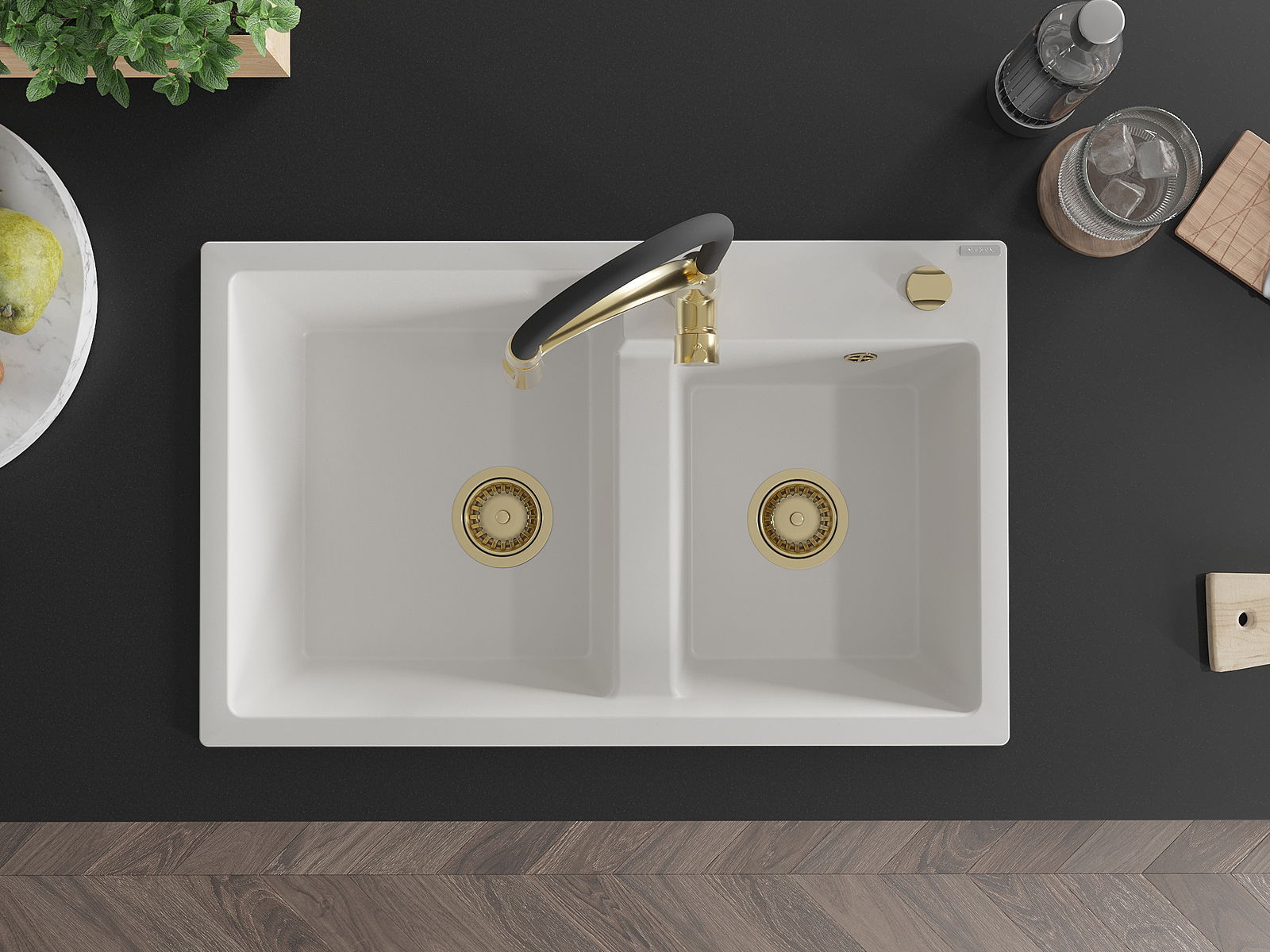 De Spullsteen huet e virgefraist Lach mat engem Duerchmiesser vu 35 mm fir selwer auszeschloen. Et kann ënner anerem genotzt ginn fir e Spender fir Flëssegkeet z'installéieren, deen d'Präsenz vu Plastikfläschen an der Kichen eliminéiert an hir en elegante Finish gëtt.