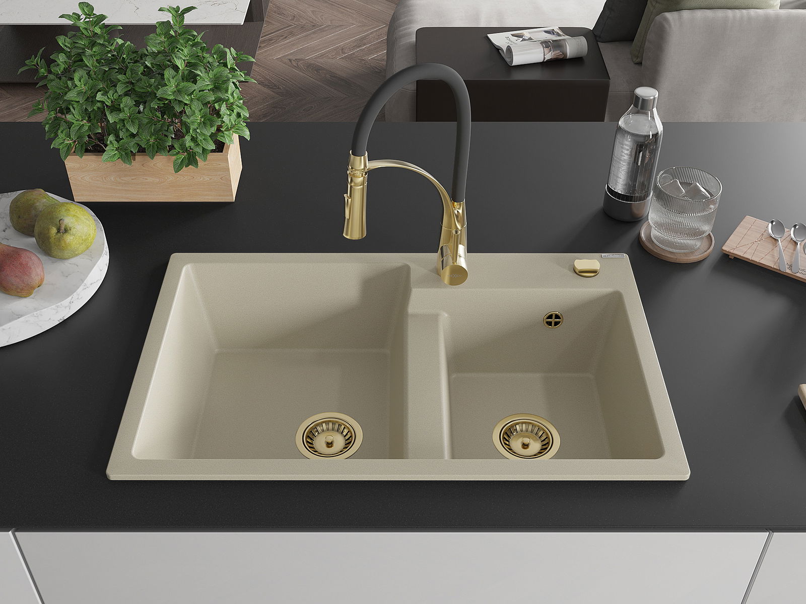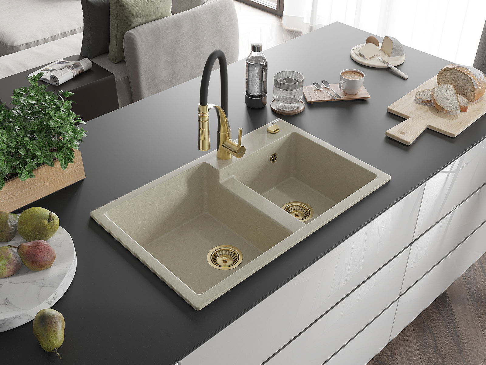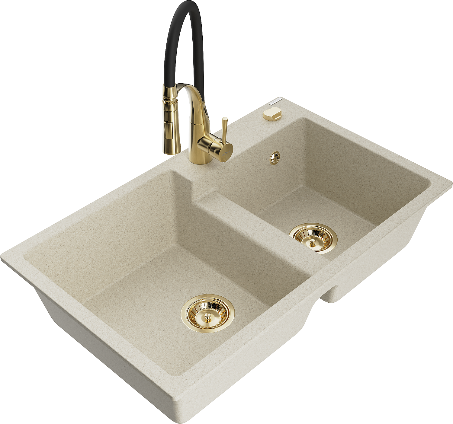 Mexen Tomas Granit-Spullsteen mat 2 Schëffer mat Kichenkran Aster, béich - 6516-69-73450-57-G
