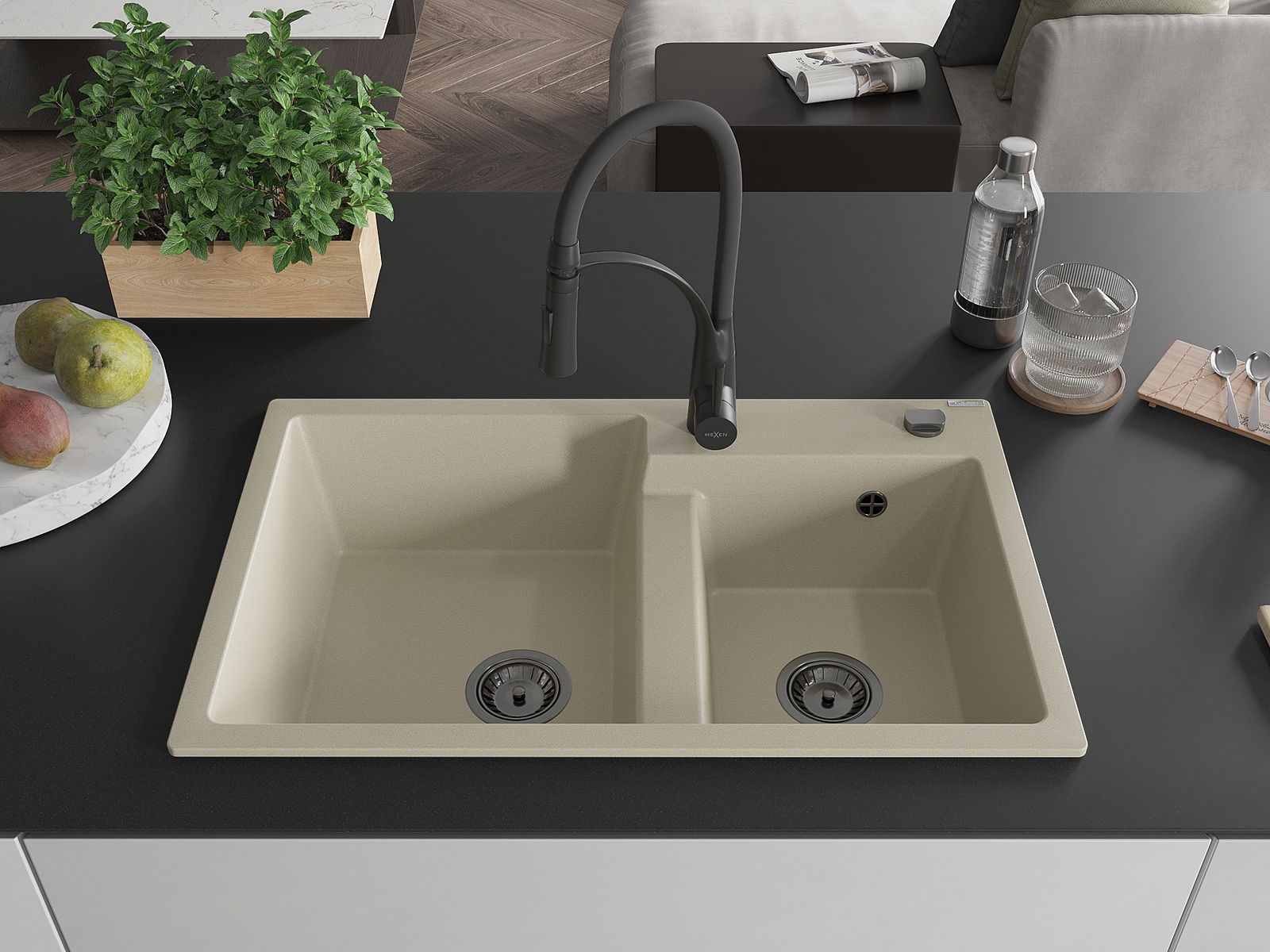 Mexen Tomas granitto Spullsteen mat zwou Becherschäiner a Kichenbatterie Aster, béisch - 6516-69-73450-70-B