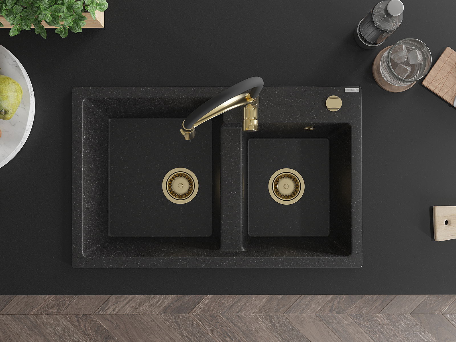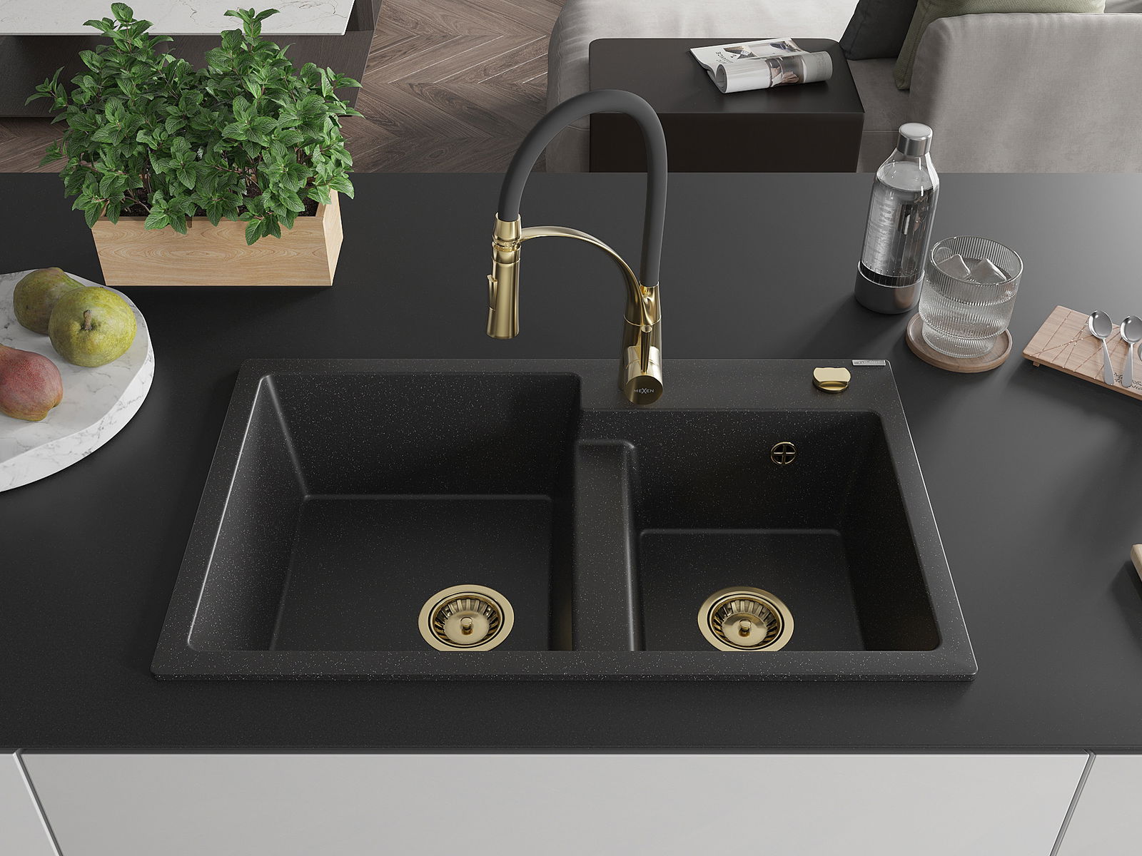 Mexen Tomas Granit-Spullsteen mat 2-Schanken mat Küchenhahn Aster, schwarz/sëlwermetallic - 6516-73-73450-57-G