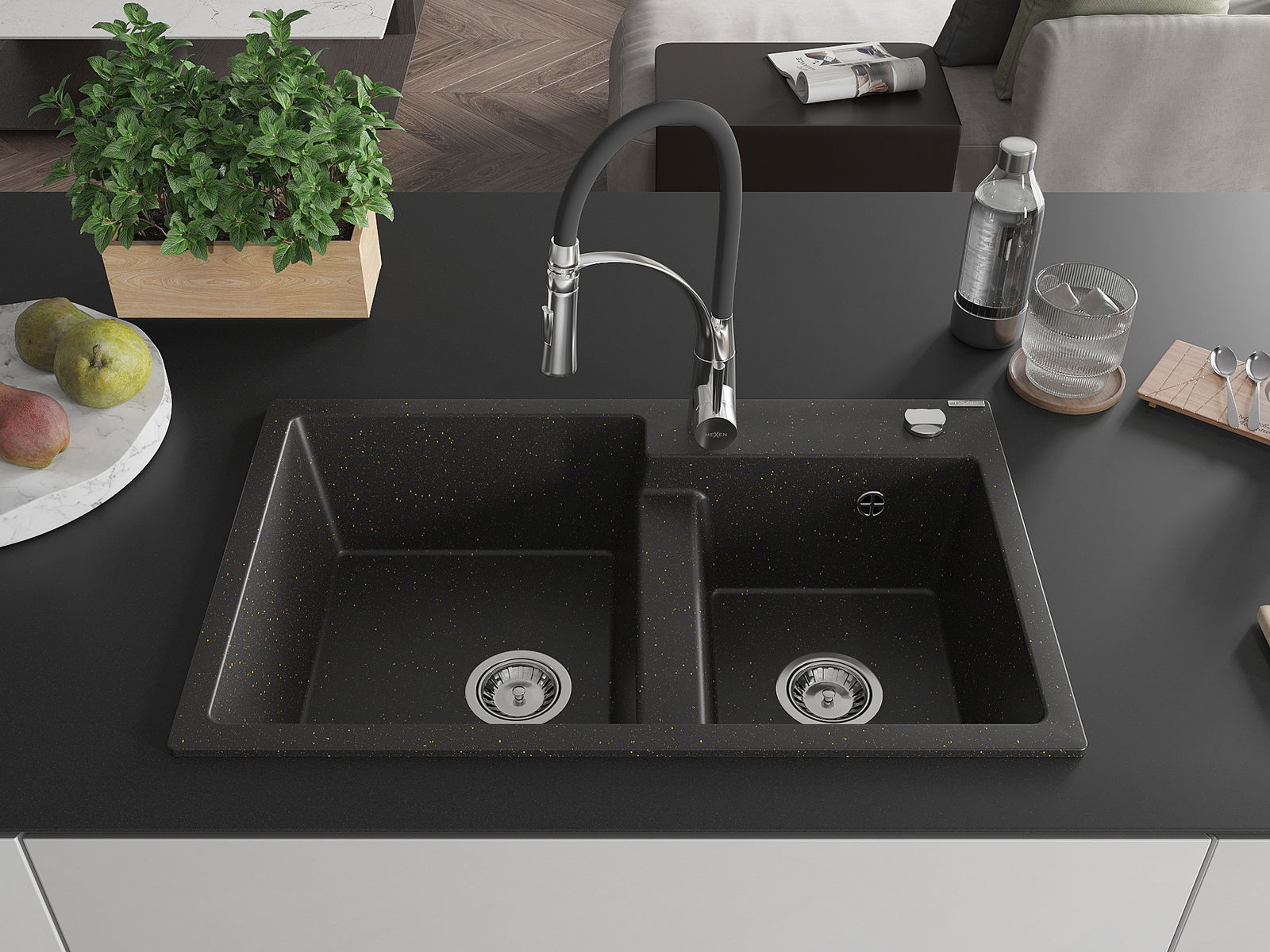 Mexen Tomas Granitspullvermat 2-Kummeren mat Kichkraaft Aster, schwaarz/golde Metallen - 6516-75-73450-07