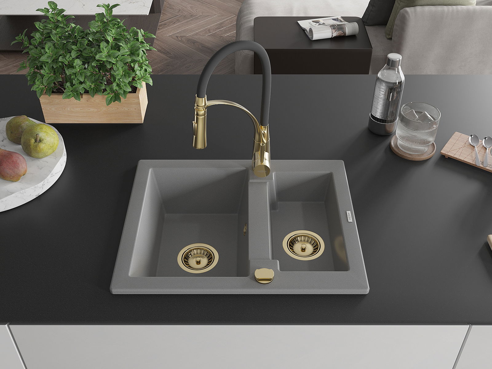 Den Ëmwäschbecken ass aus héichwäertege Granit gemaach. Et stellt eng elegant awer virun allem praktesch Ergänzung fir all Kichen duer, onofhängeg vun hirem Stil. Déi héich Qualitéit an Haltbarkeet vum Granit suergen fir méi järelaang Benotzung.