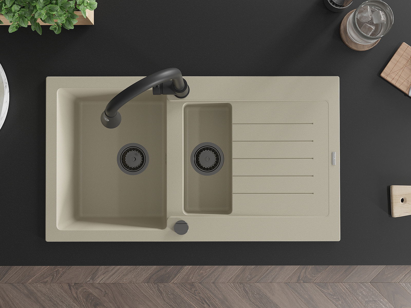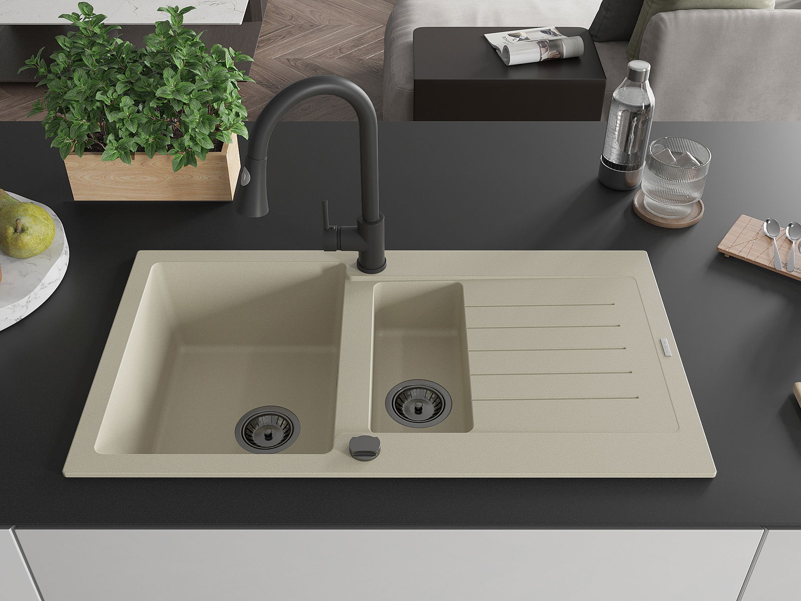 Mexen Matias Granitspulltauch 1,5-Compartiment mat Ofwäschflächen an Kichekraan Elia, béis - 6502-69-670101-70