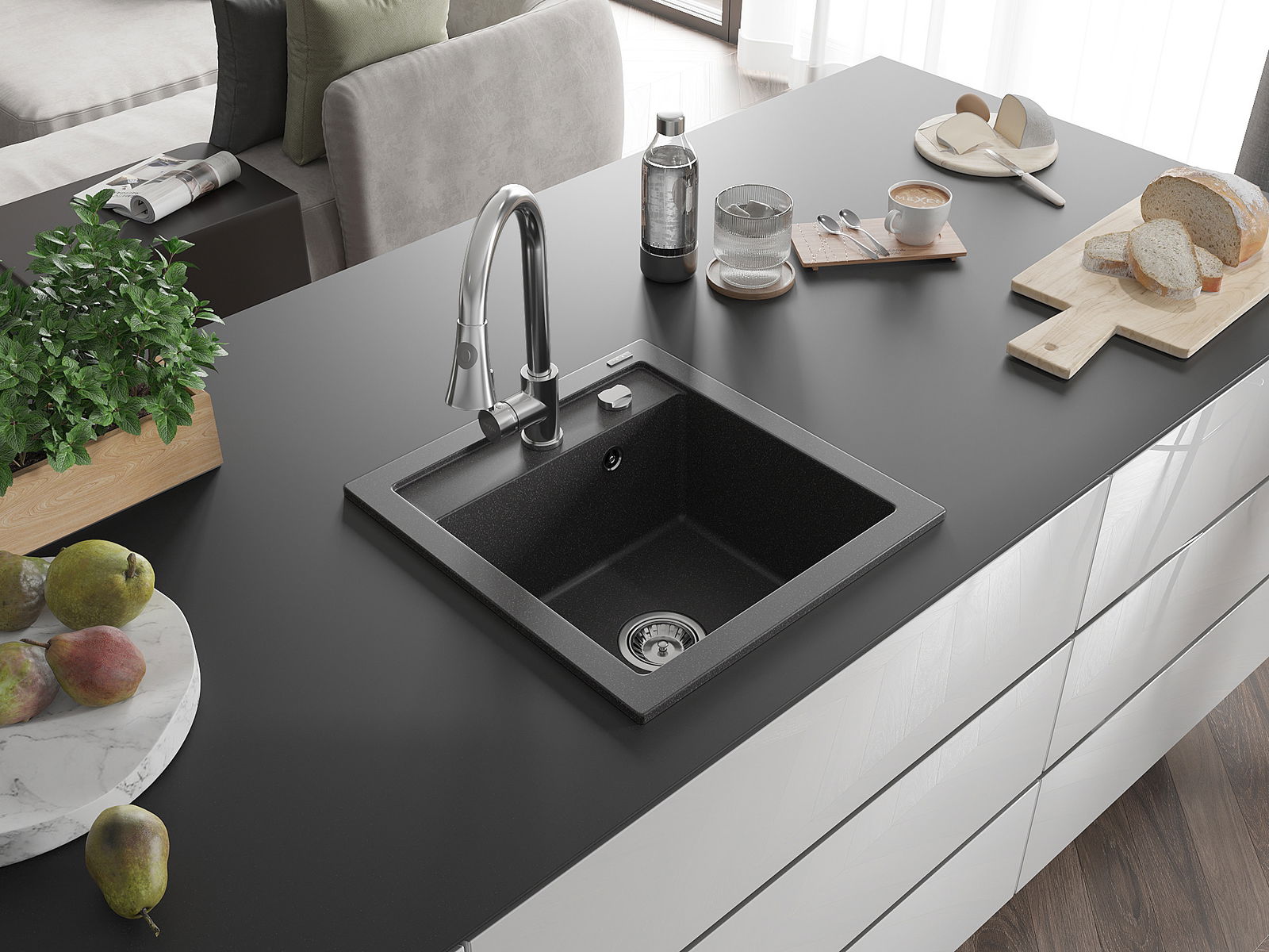 De Spullsteen huet e virgefraist Lach mat engem Duerchmiesser vu 35 mm fir selwer auszeschloen. Et kann ënner anerem genotzt ginn fir e Spender fir Flëssegkeet z'installéieren, deen d'Präsenz vu Plastikfläschen an der Kichen eliminéiert an hir en elegante Finish gëtt.