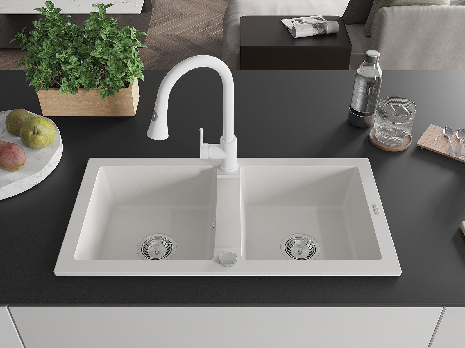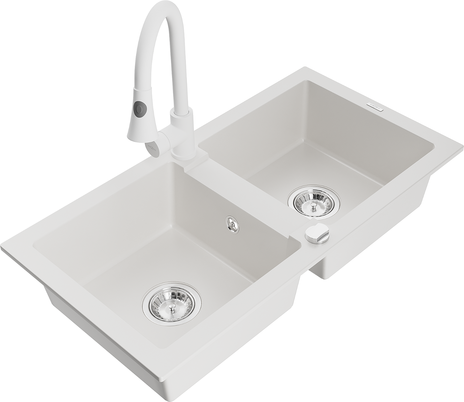 Mexen Mario Granit-Spullsteen mat 2 Kommare mat Kichenkraan Elia, wäiss - 6504-20-670101-20