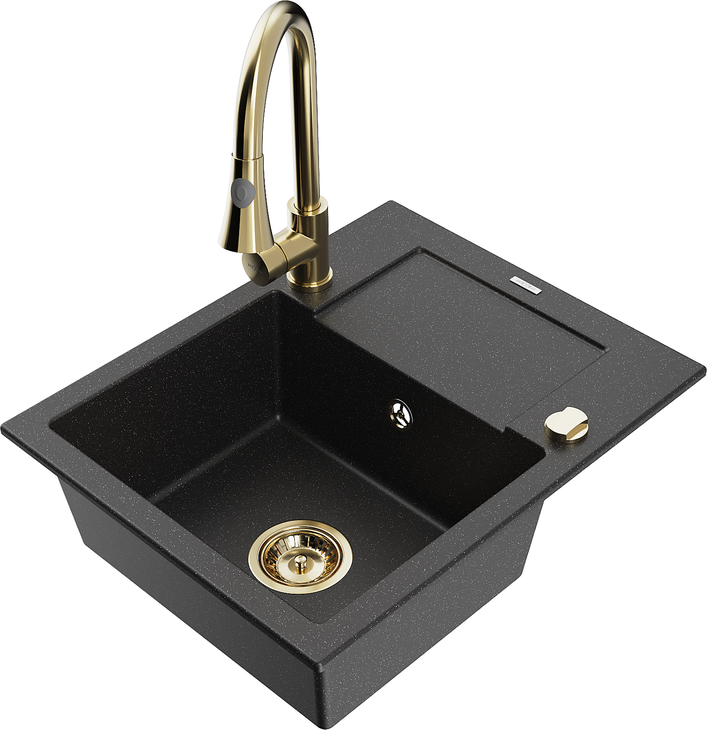 Mexen Enzo Granit-Spullensbaak mat enger Kammer mat Drëpsschal an Kichenkran Elia, schwaarz/sëlwer Metallic