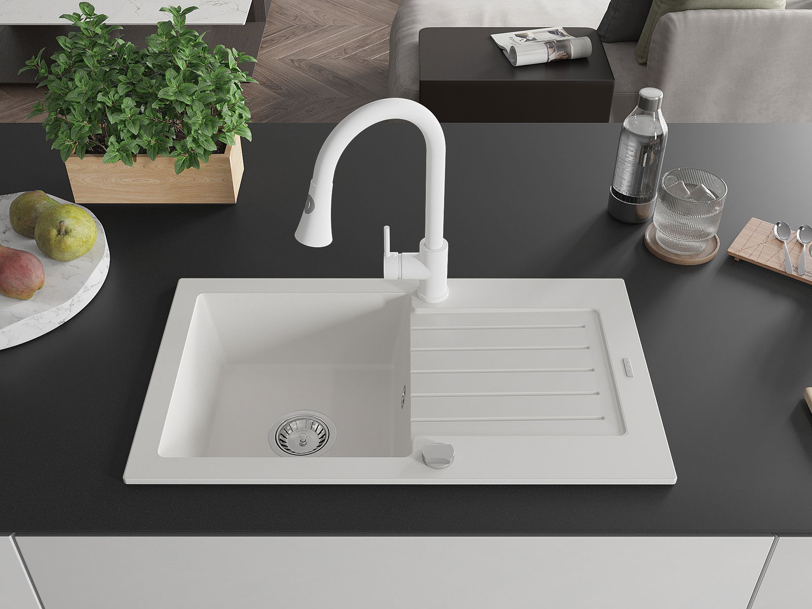 Mexen Pablo eentleche Granitischt-Spullsteen mat Drainage an Kichenkrunn Elia, wäiss - 6510-20-670101-20