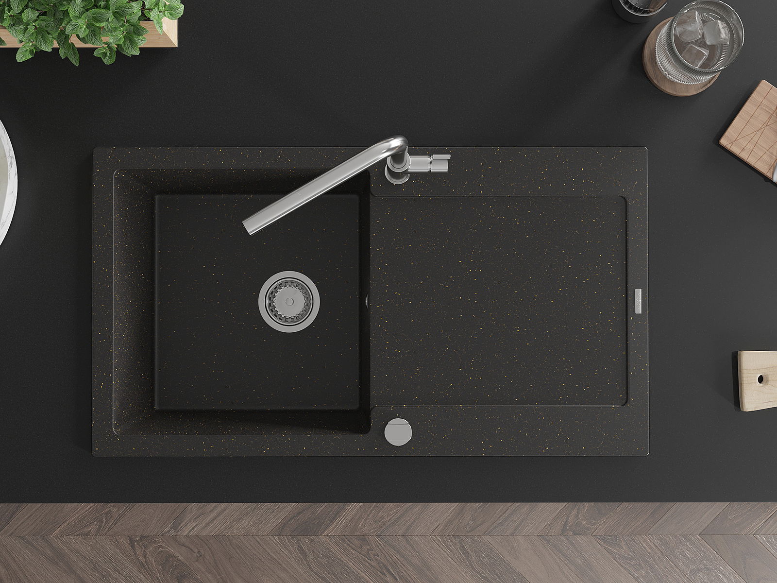 Mexen Leo Granit-Spullsteen mat enger Schoss an engem Drëpsstand mat Kichenkran Flora, schwaarz/gëllene Metallick