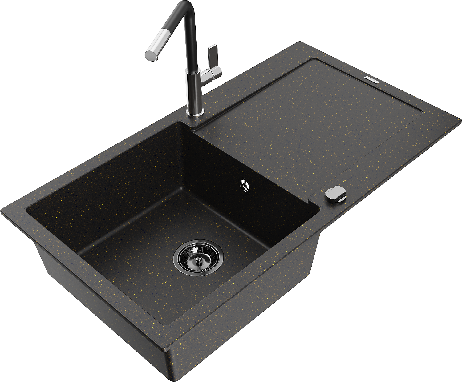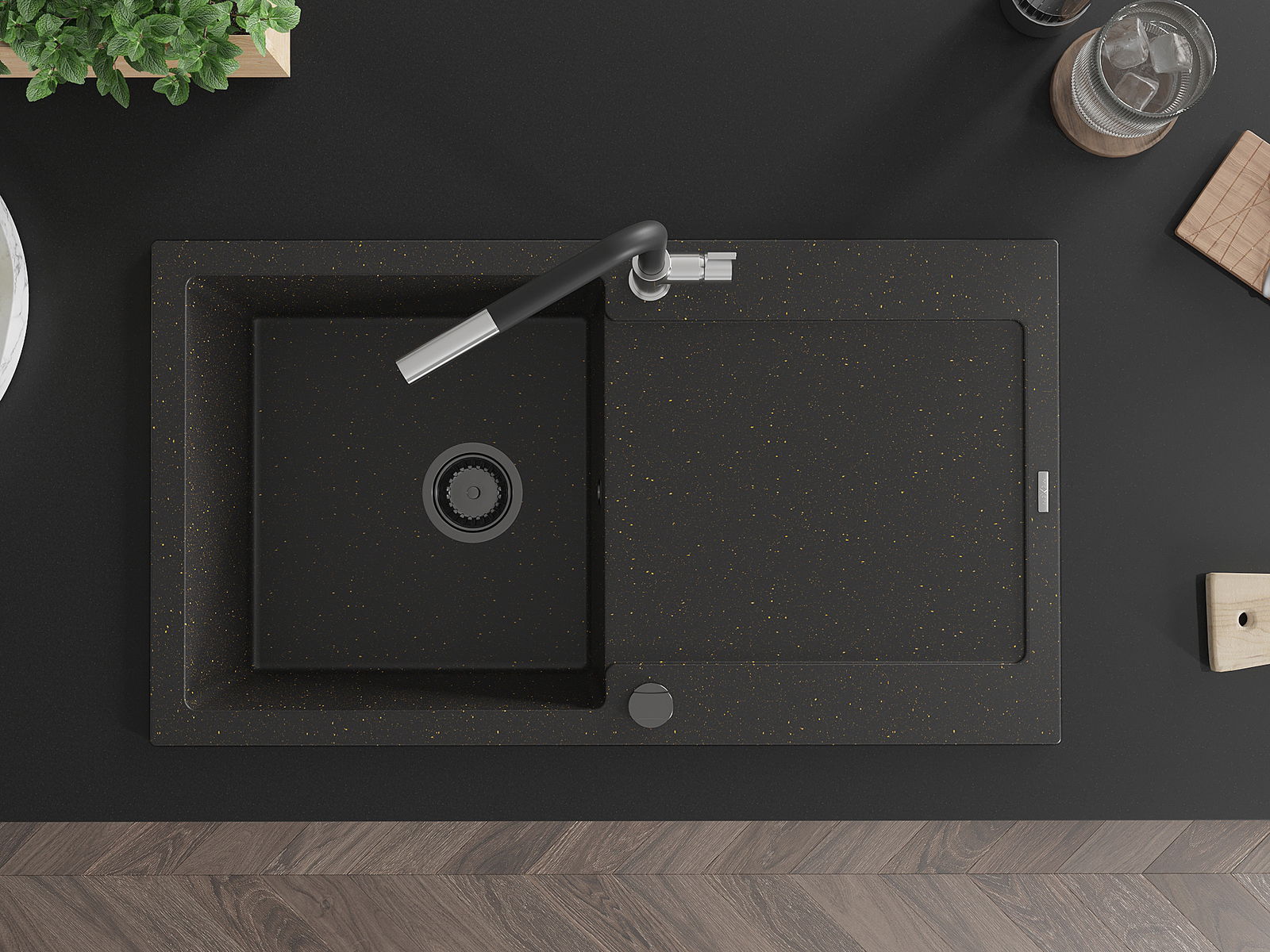 Mexen Leo een-Compartiments Granitten Spullsteen mat Drëpsnetz a Kichenkraan Flora, schwaarz/gëllene Metalik