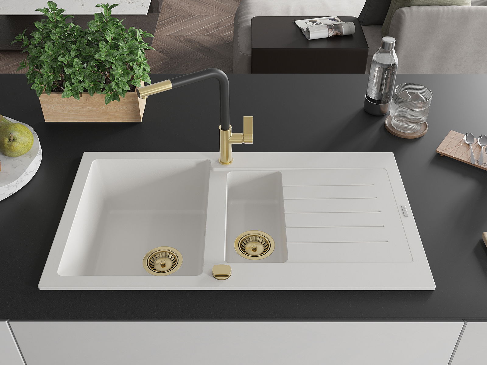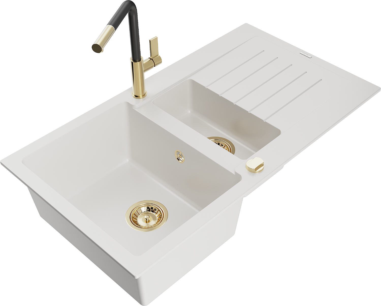 Den Spullsteen huet 2 virberäitet Lächer mat engem Duerchmiesser vun 35 mm, déi selbststänneg ausgeschloen kënne ginn. Se kënne fir d'Montage vun engem Flëssegkeetsspender benotzt ginn, deen d'Präsenz vu Plastikfläschen an der Kichen eliminéiert an hir en elegant Finish gëtt.