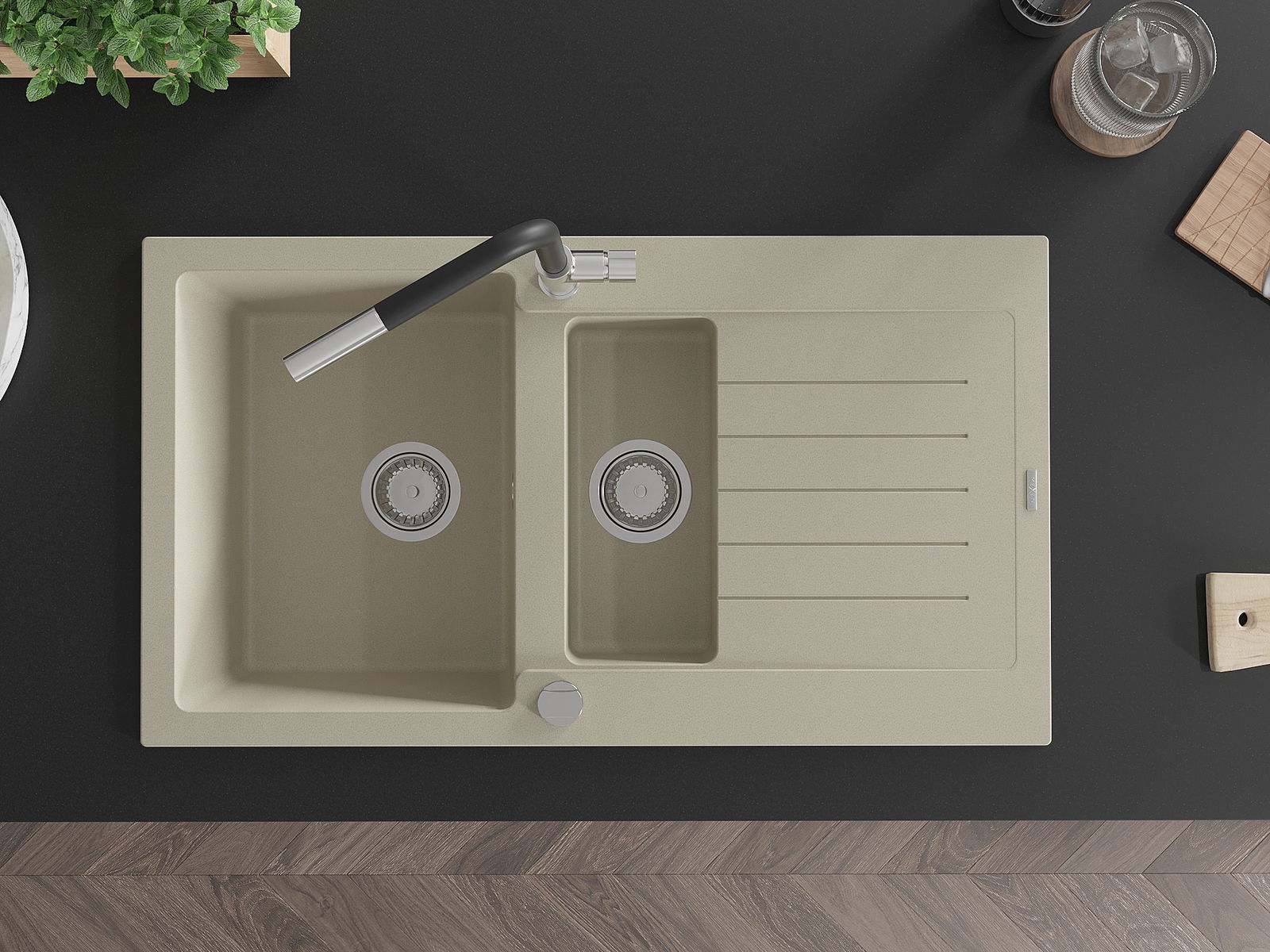 Den Ëmwäschbecken ass aus héichwäertege Granit gemaach. Et stellt eng elegant awer virun allem praktesch Ergänzung fir all Kichen duer, onofhängeg vun hirem Stil. Déi héich Qualitéit an Haltbarkeet vum Granit suergen fir méi järelaang Benotzung.
