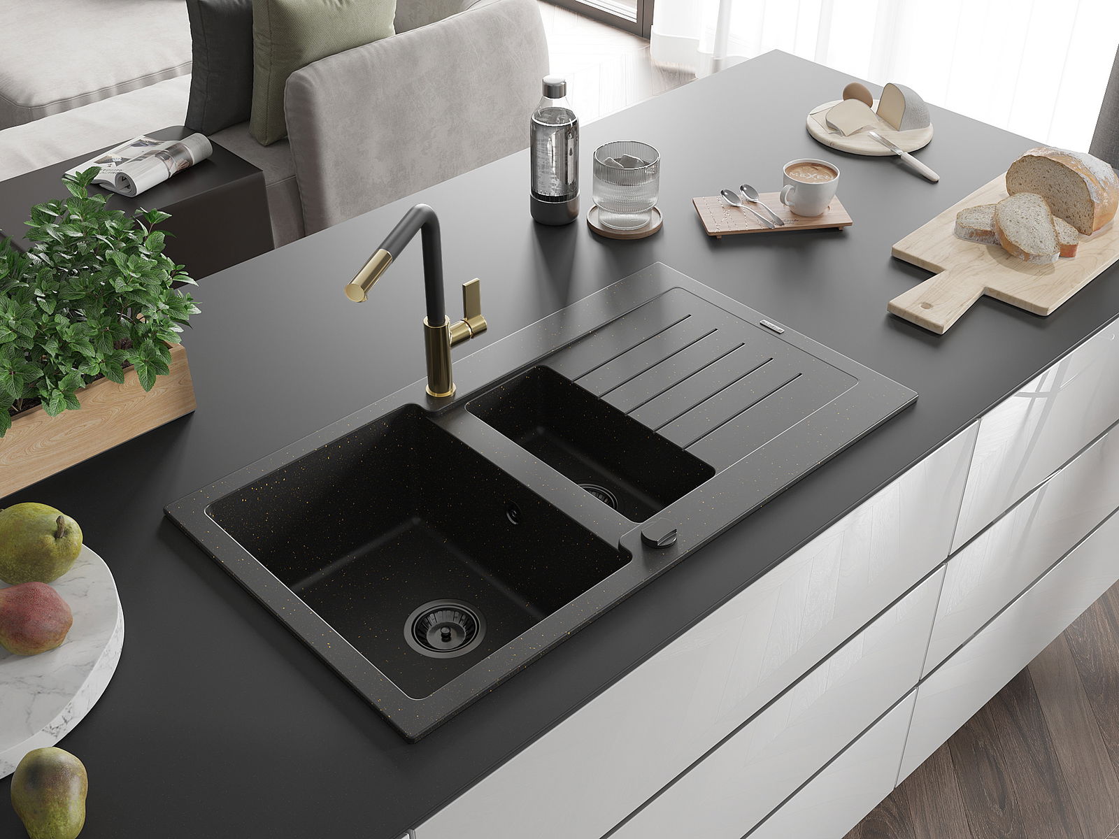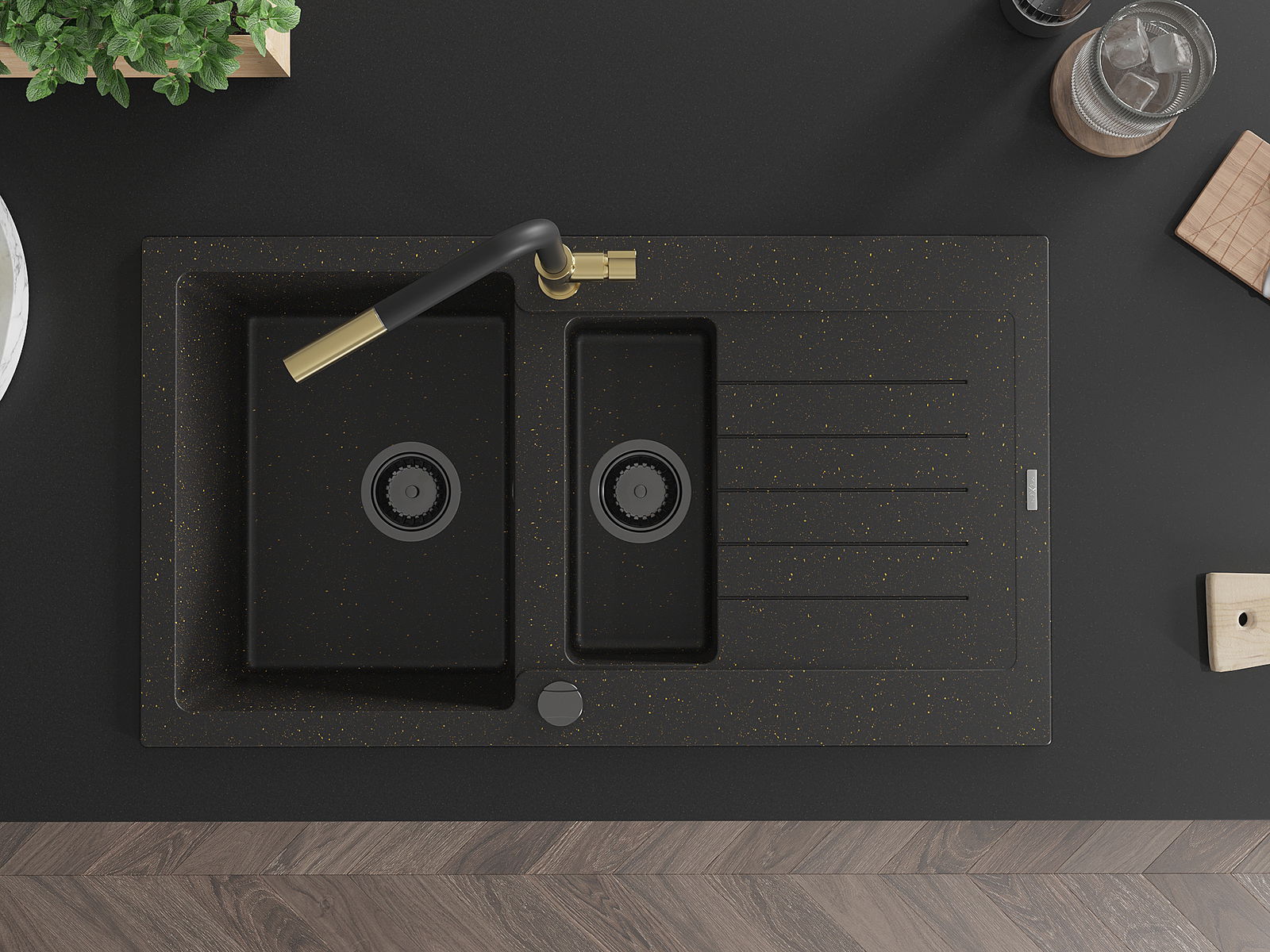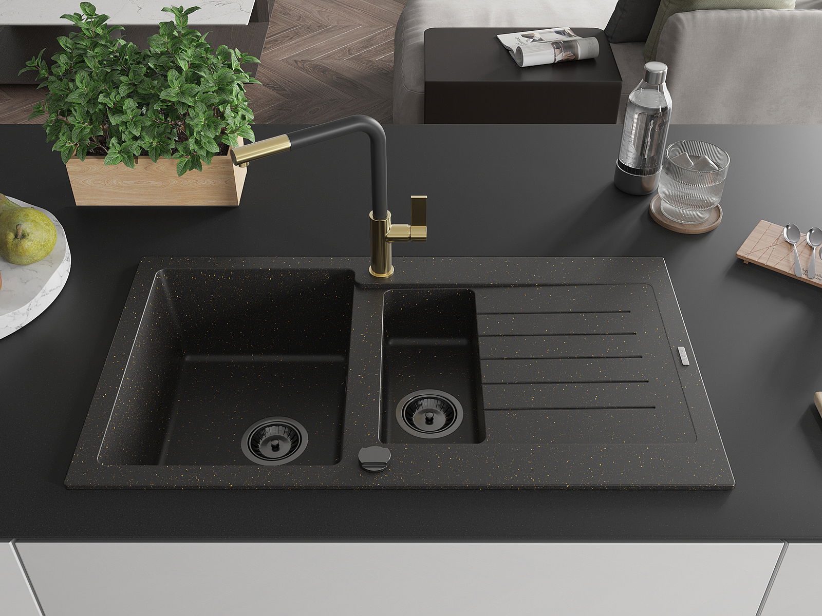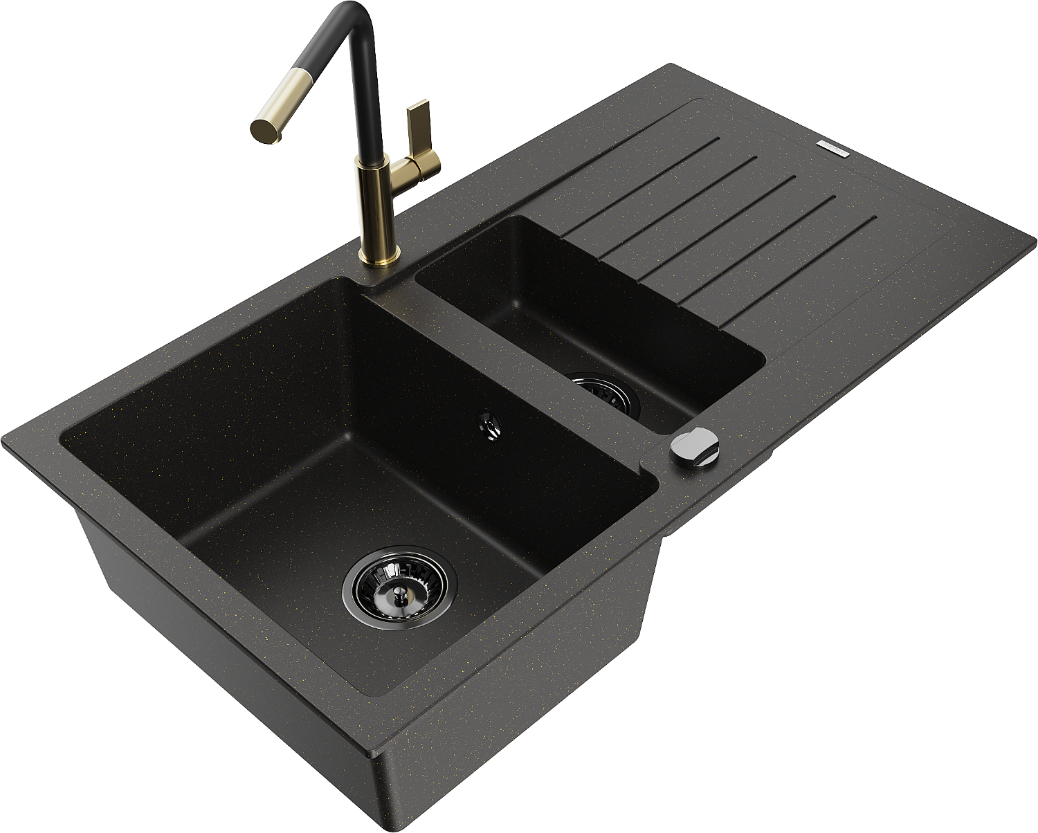 Den Spullsteen huet 2 virberäitet Lächer mat engem Duerchmiesser vun 35 mm, déi selbststänneg ausgeschloen kënne ginn. Se kënne fir d'Montage vun engem Flëssegkeetsspender benotzt ginn, deen d'Präsenz vu Plastikfläschen an der Kichen eliminéiert an hir en elegant Finish gëtt.