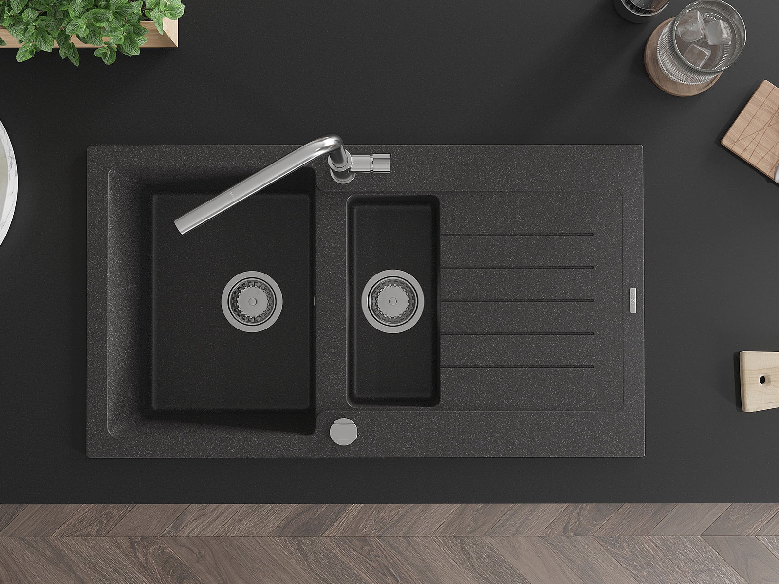 Den Ëmwäschbecken ass aus héichwäertege Granit gemaach. Et stellt eng elegant awer virun allem praktesch Ergänzung fir all Kichen duer, onofhängeg vun hirem Stil. Déi héich Qualitéit an Haltbarkeet vum Granit suergen fir méi järelaang Benotzung.
