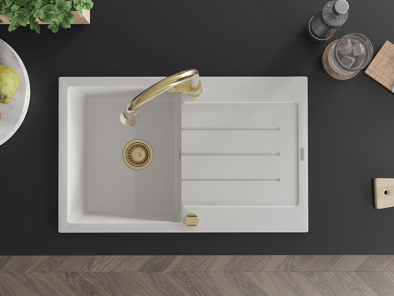 Mexen Bruno 1-Schacht Granitspullsteen mat Oflaafberäich an Kichenkran Elia, wäiss - 6513-20-670101-50