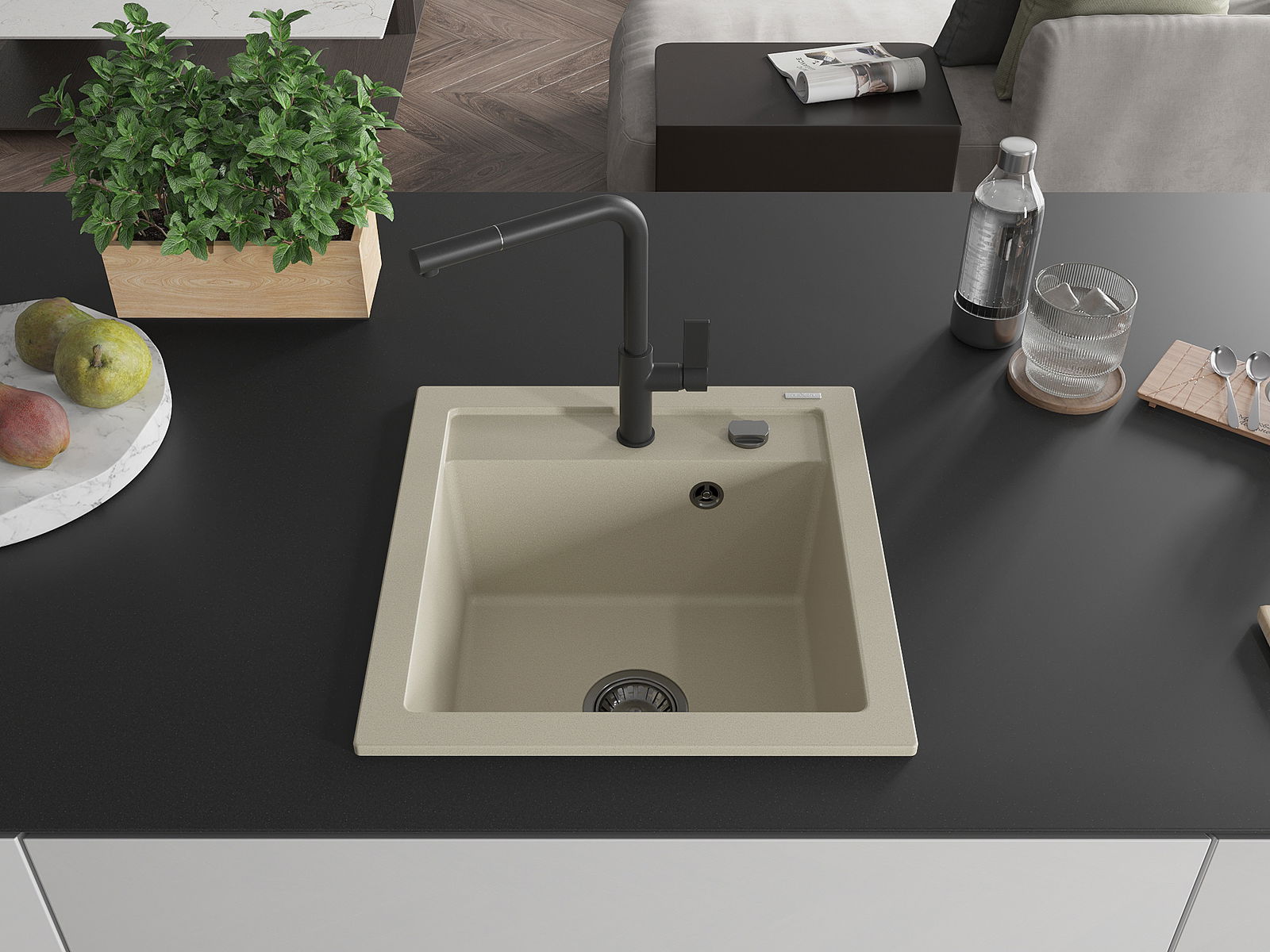 De Spullsteen huet e virgefraist Lach mat engem Duerchmiesser vu 35 mm fir selwer auszeschloen. Et kann ënner anerem genotzt ginn fir e Spender fir Flëssegkeet z'installéieren, deen d'Präsenz vu Plastikfläschen an der Kichen eliminéiert an hir en elegante Finish gëtt.