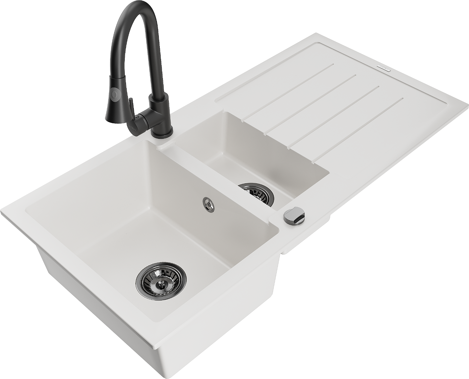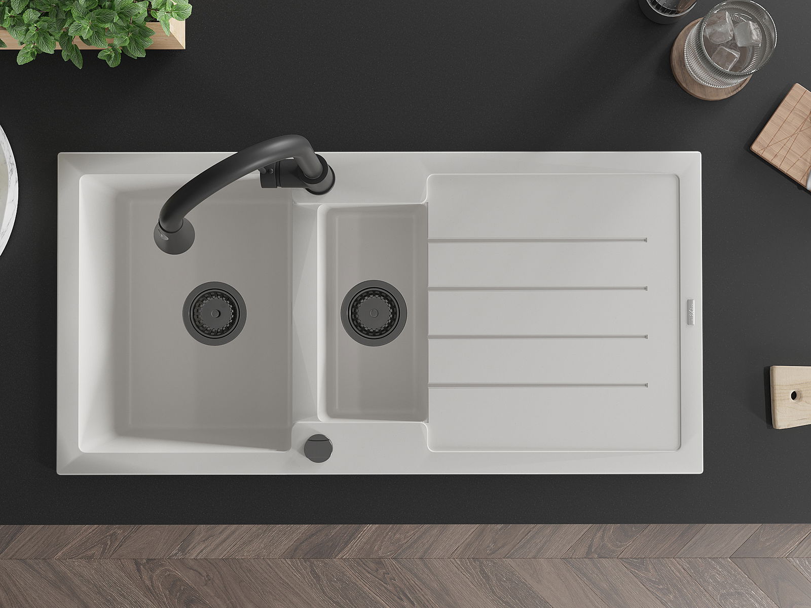 Mexen Andres Granit Kichenzeil 1,5-Schëff mat Drëpsenregal an Kichekran Elia, wäiss - 6515-20-670101-70