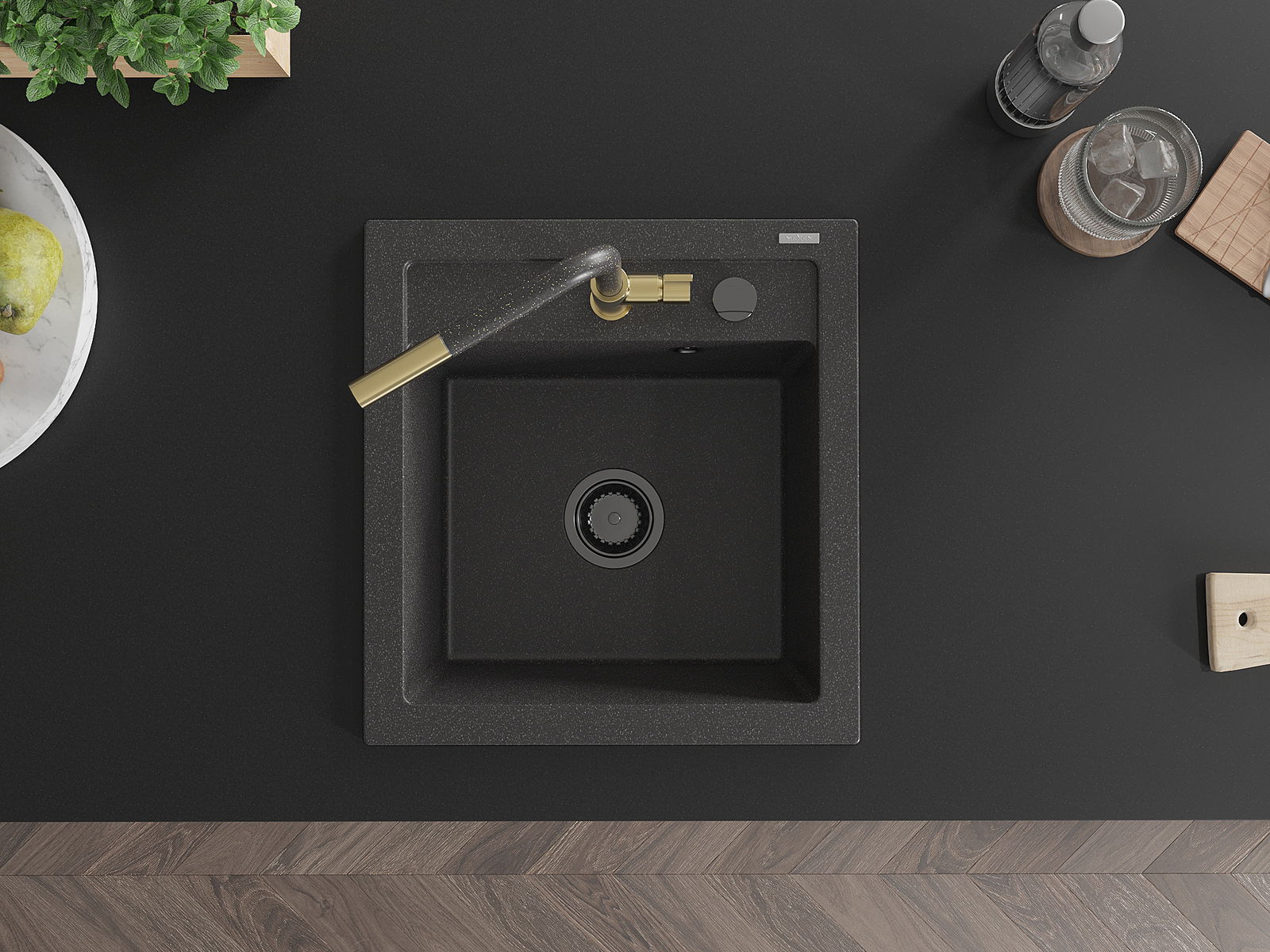 De Spullsteen huet e virgefraist Lach mat engem Duerchmiesser vu 35 mm fir selwer auszeschloen. Et kann ënner anerem genotzt ginn fir e Spender fir Flëssegkeet z'installéieren, deen d'Präsenz vu Plastikfläschen an der Kichen eliminéiert an hir en elegante Finish gëtt.