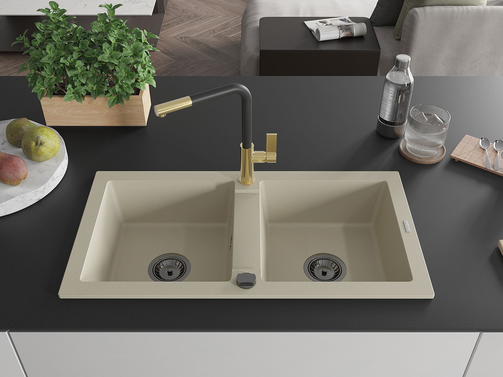 Den Ëmwäschbecken ass aus héichwäertege Granit gemaach. Et stellt eng elegant awer virun allem praktesch Ergänzung fir all Kichen duer, onofhängeg vun hirem Stil. Déi héich Qualitéit an Haltbarkeet vum Granit suergen fir méi järelaang Benotzung.