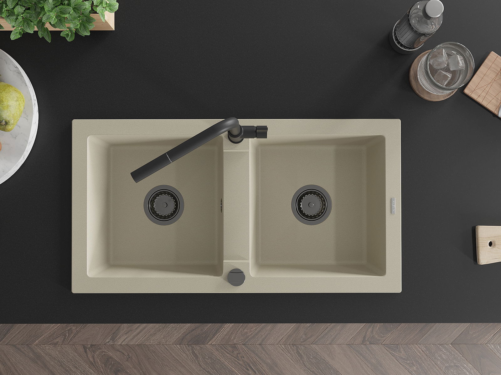 Mexen Mario granitësche Spullsteen mat 2 Becken a Kichenkran Flora, béige - 6504-69-670401-70-B