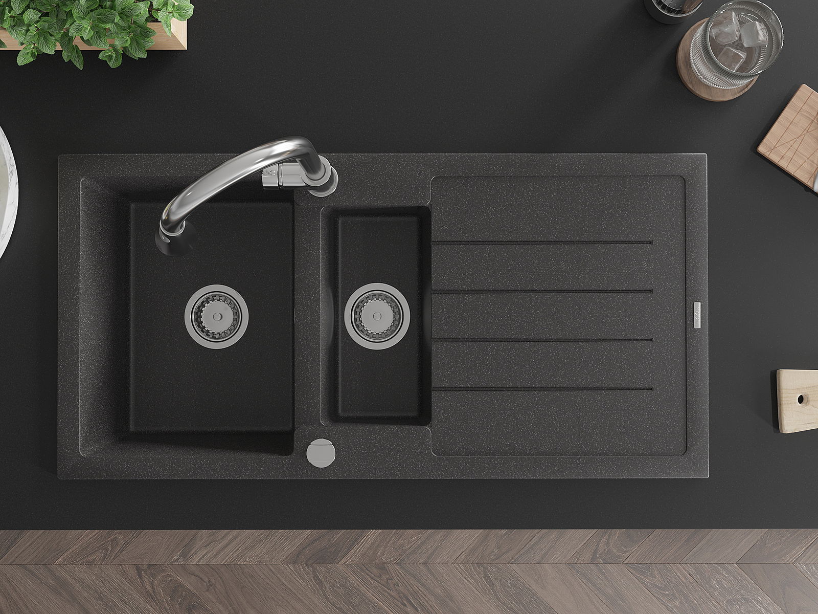 Den Ëmwäschbecken ass aus héichwäertege Granit gemaach. Et stellt eng elegant awer virun allem praktesch Ergänzung fir all Kichen duer, onofhängeg vun hirem Stil. Déi héich Qualitéit an Haltbarkeet vum Granit suergen fir méi järelaang Benotzung.