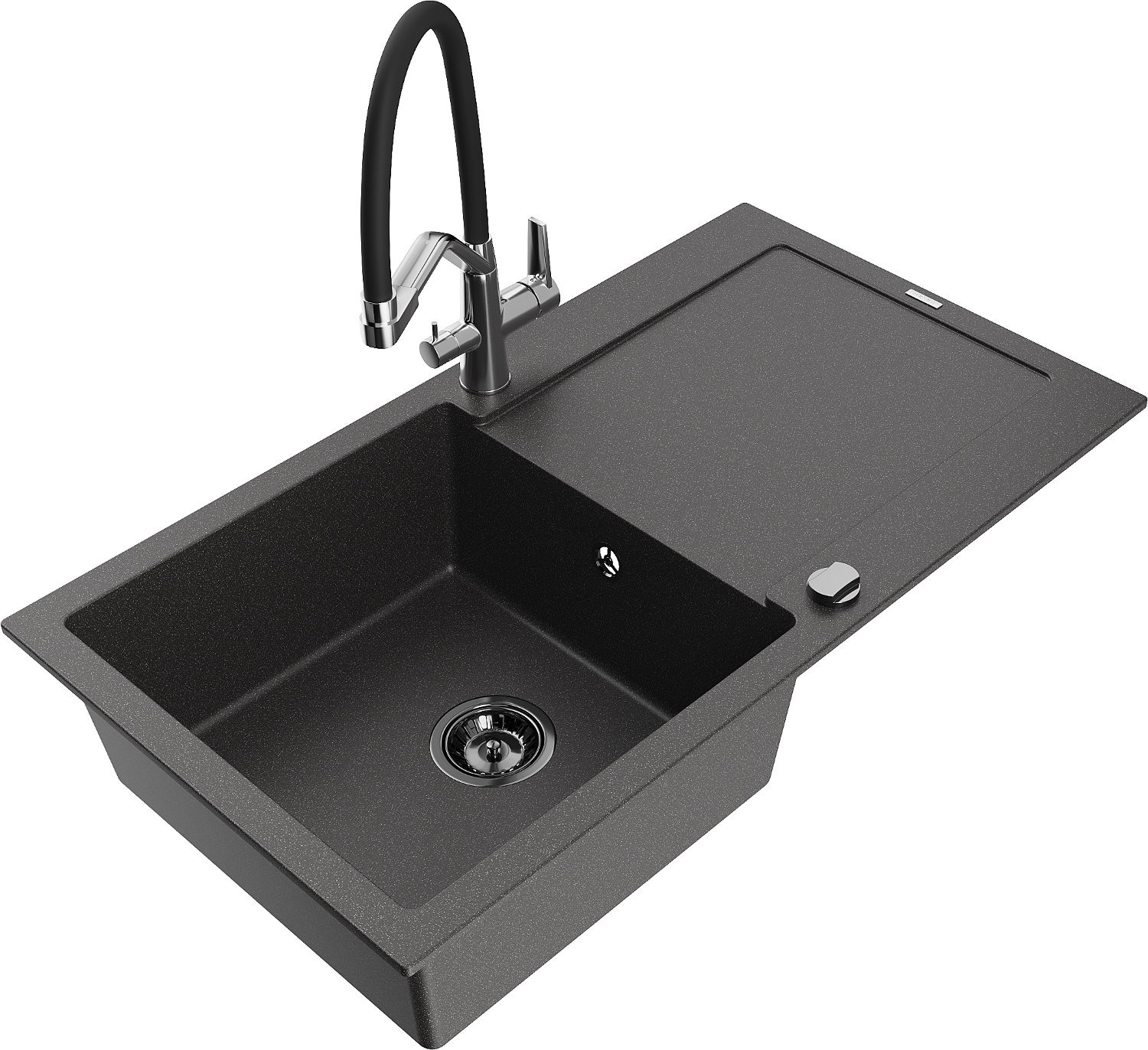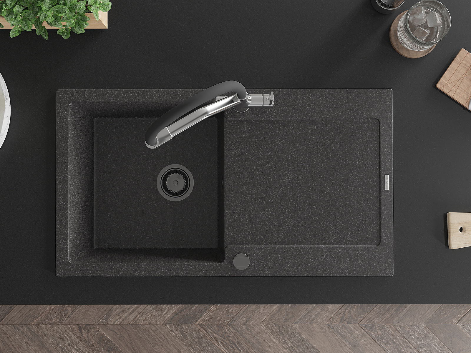 Mexen Leo 1-Schacht Granitspullsteen mat Ablaf an Kichendësch Duo, schwaarz gefleckt - 6501-76-671701-07-B