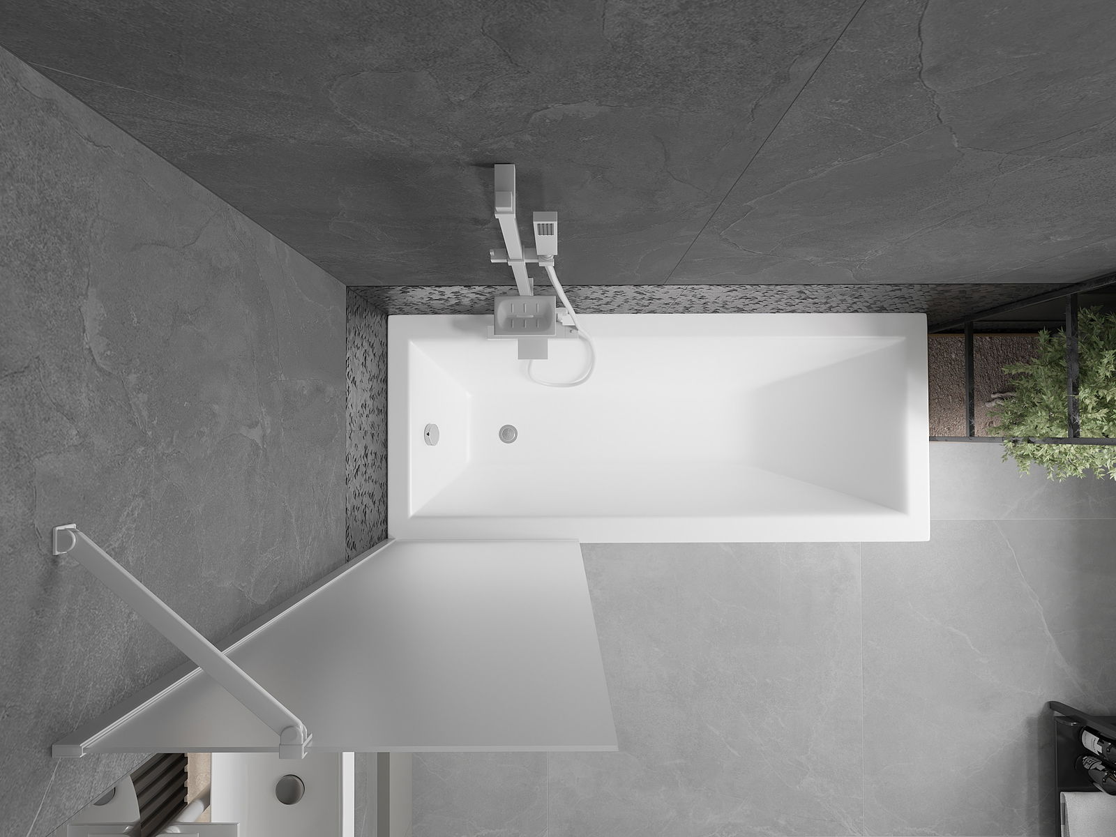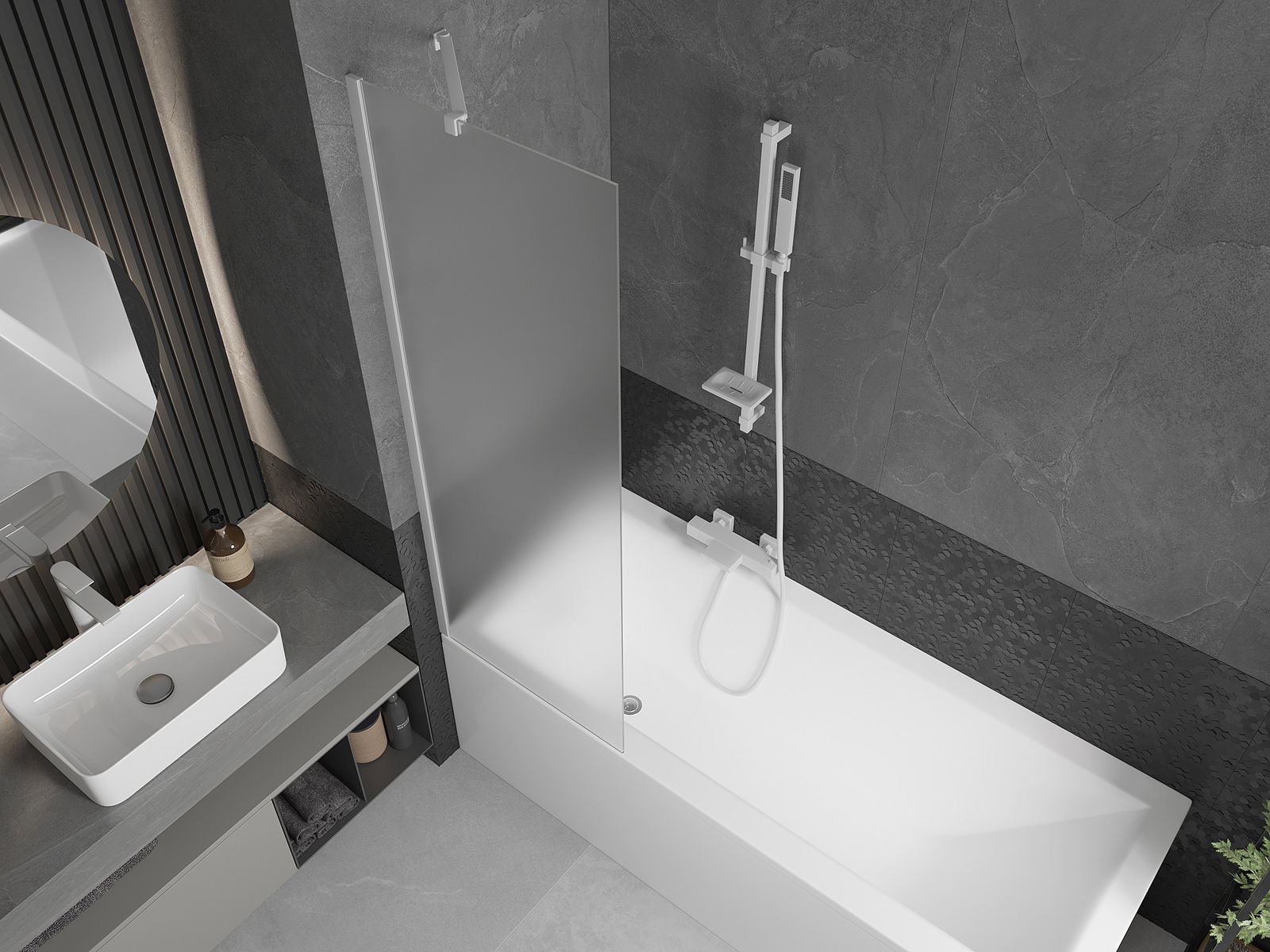 Dank dem universellen Montagesystem kann de Paravent je no Bedierfness op der rietser oder lénkser Säit montéiert ginn. Sou kanns de eng Dusch plangen, déi op de Raum vun der Buedzëmmer ugepasst ass.