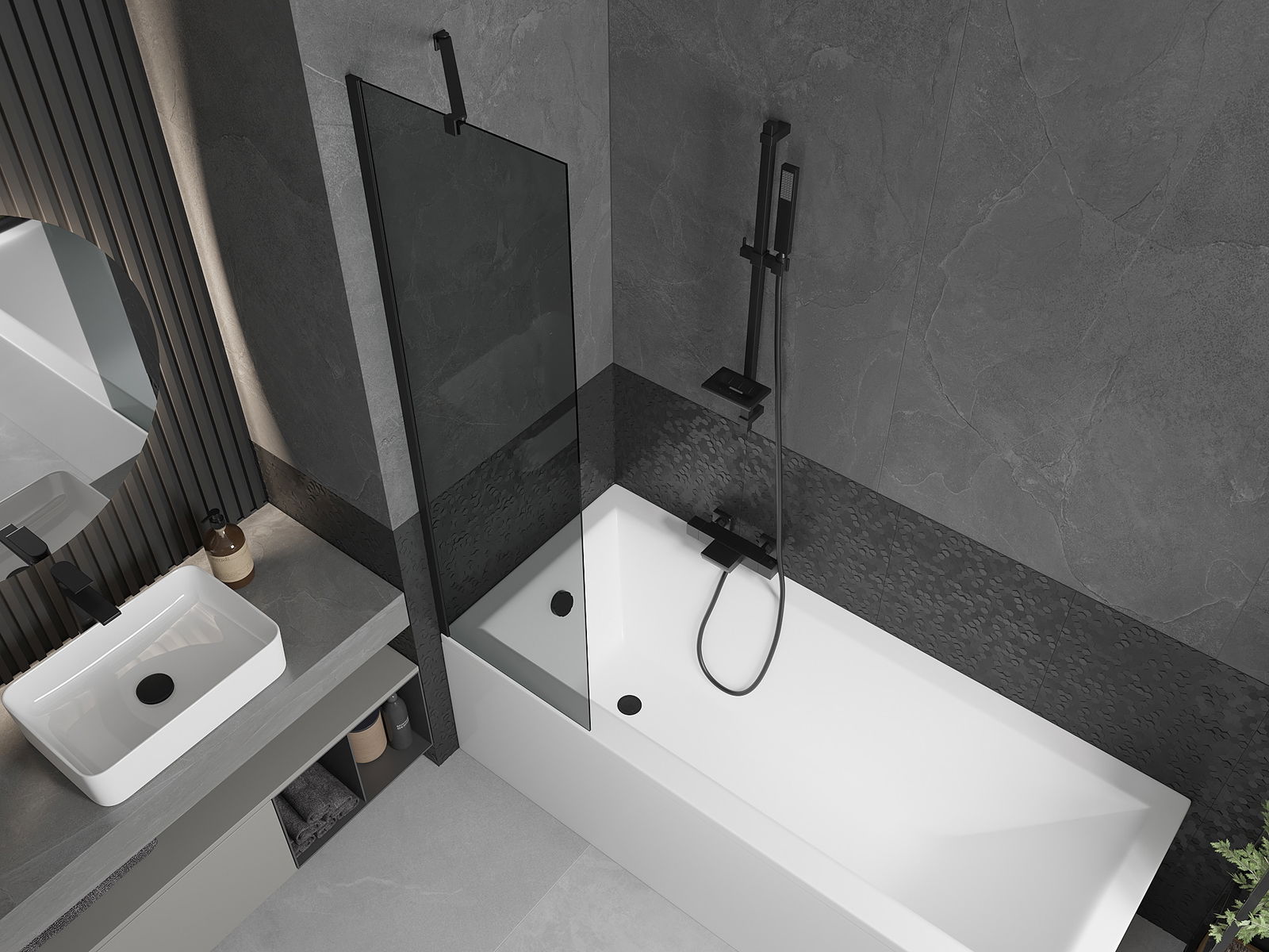 Dank dem universellen Montagesystem kann de Paravent je no Bedierfness op der rietser oder lénkser Säit montéiert ginn. Sou kanns de eng Dusch plangen, déi op de Raum vun der Buedzëmmer ugepasst ass.