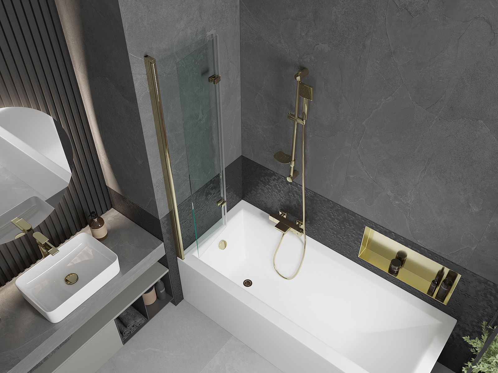 E Parawan aus zwee Flille mat der Méiglechkeet vum Zesummeklappe. Sou eng Léisung erlaabt et méi Plaz am Buedzëmmer ze spueren an erméiglecht et fräi d'reschtlecht Plaz ze benotzen, wann mer net d'Badezon benotzen.