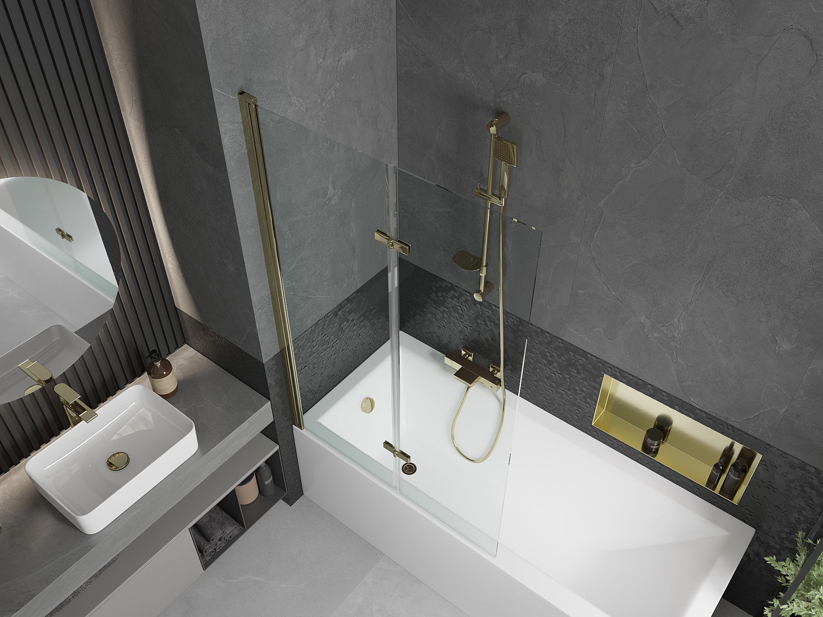 E Parawan aus zwee Flille mat der Méiglechkeet vum Zesummeklappe. Sou eng Léisung erlaabt et méi Plaz am Buedzëmmer ze spueren an erméiglecht et fräi d'reschtlecht Plaz ze benotzen, wann mer net d'Badezon benotzen.