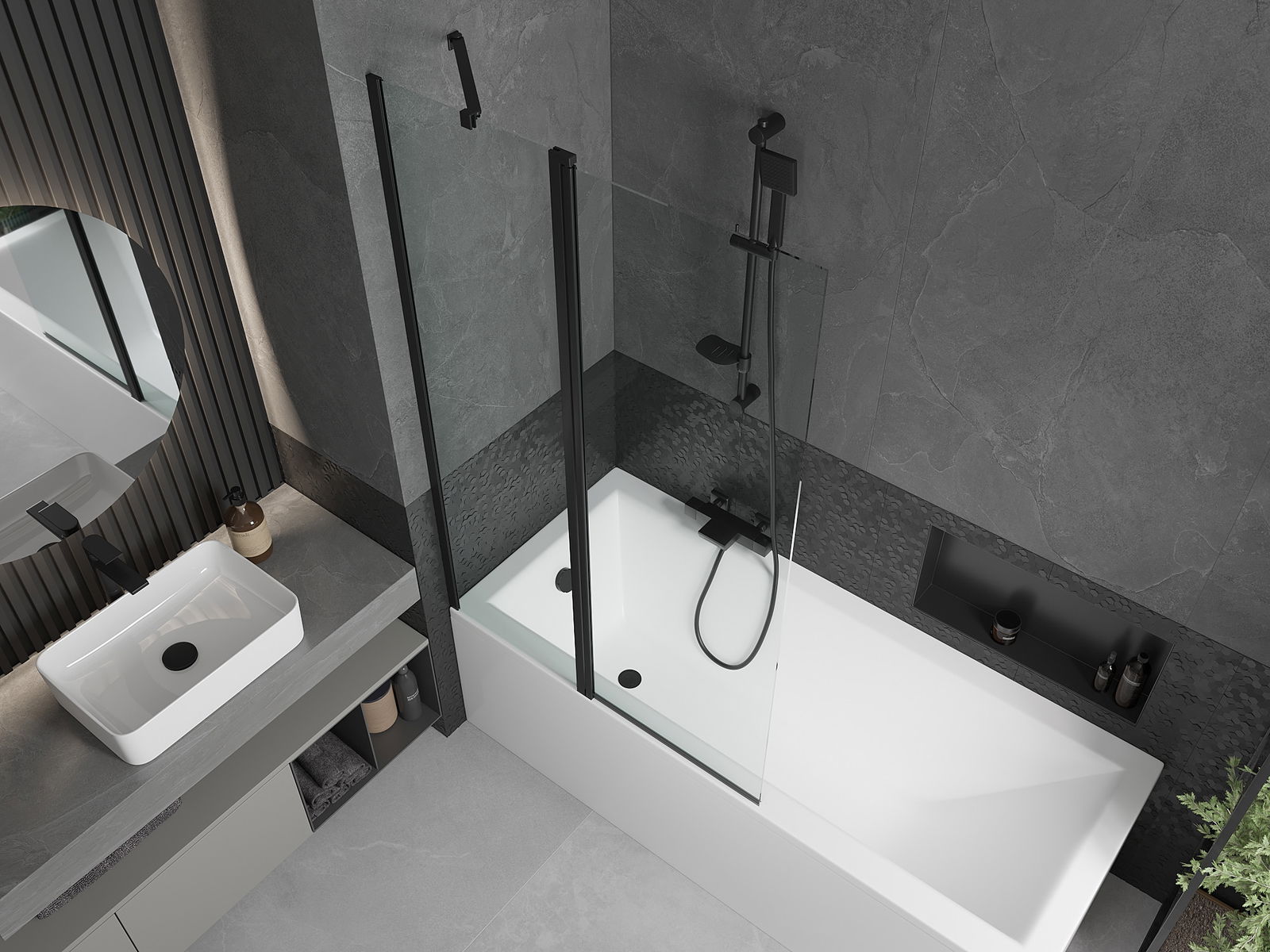 Dank dem universellen Montagesystem kann de Paravent je no Bedierfness op der rietser oder lénkser Säit montéiert ginn. Sou kanns de eng Dusch plangen, déi op de Raum vun der Buedzëmmer ugepasst ass.