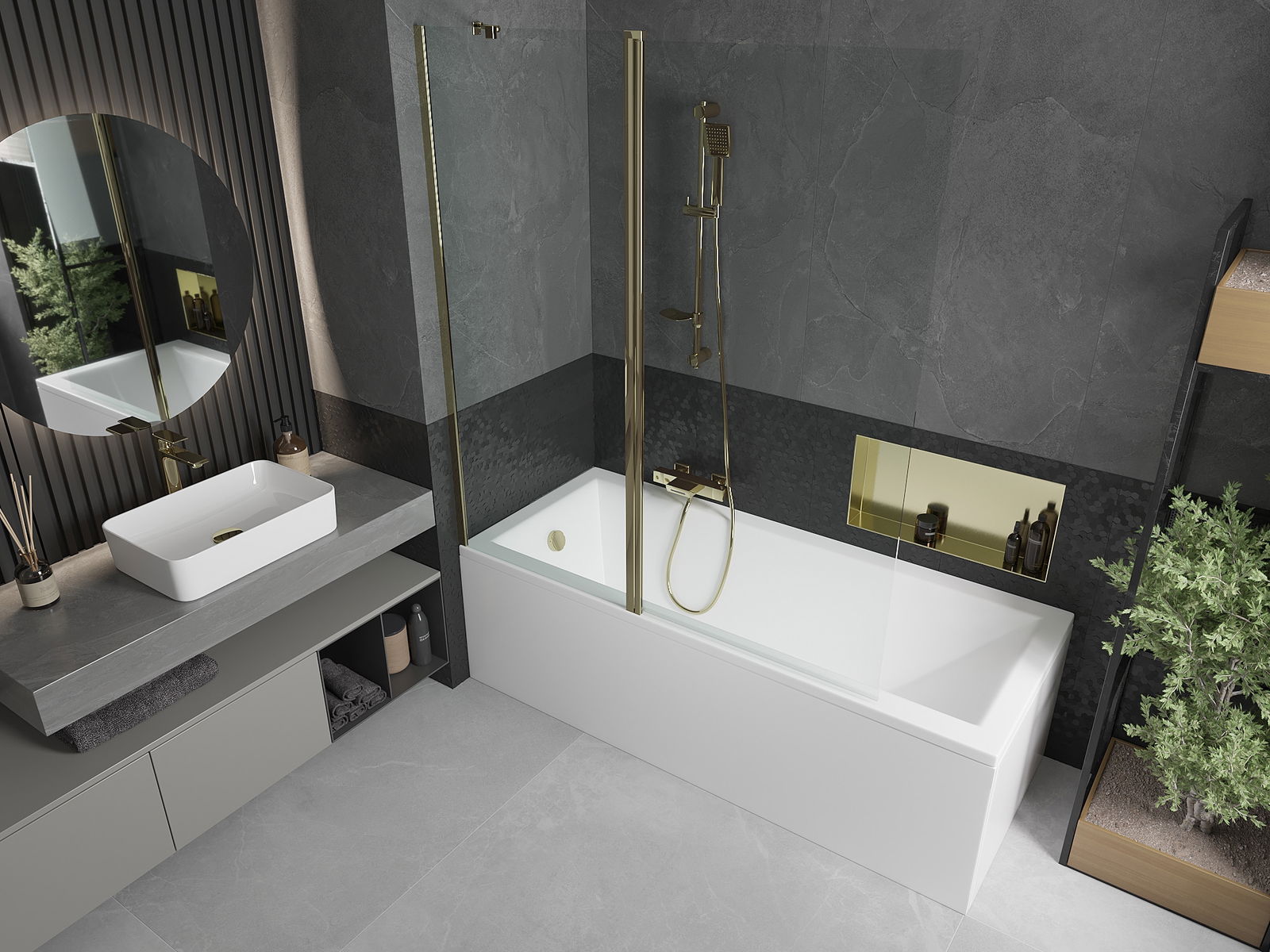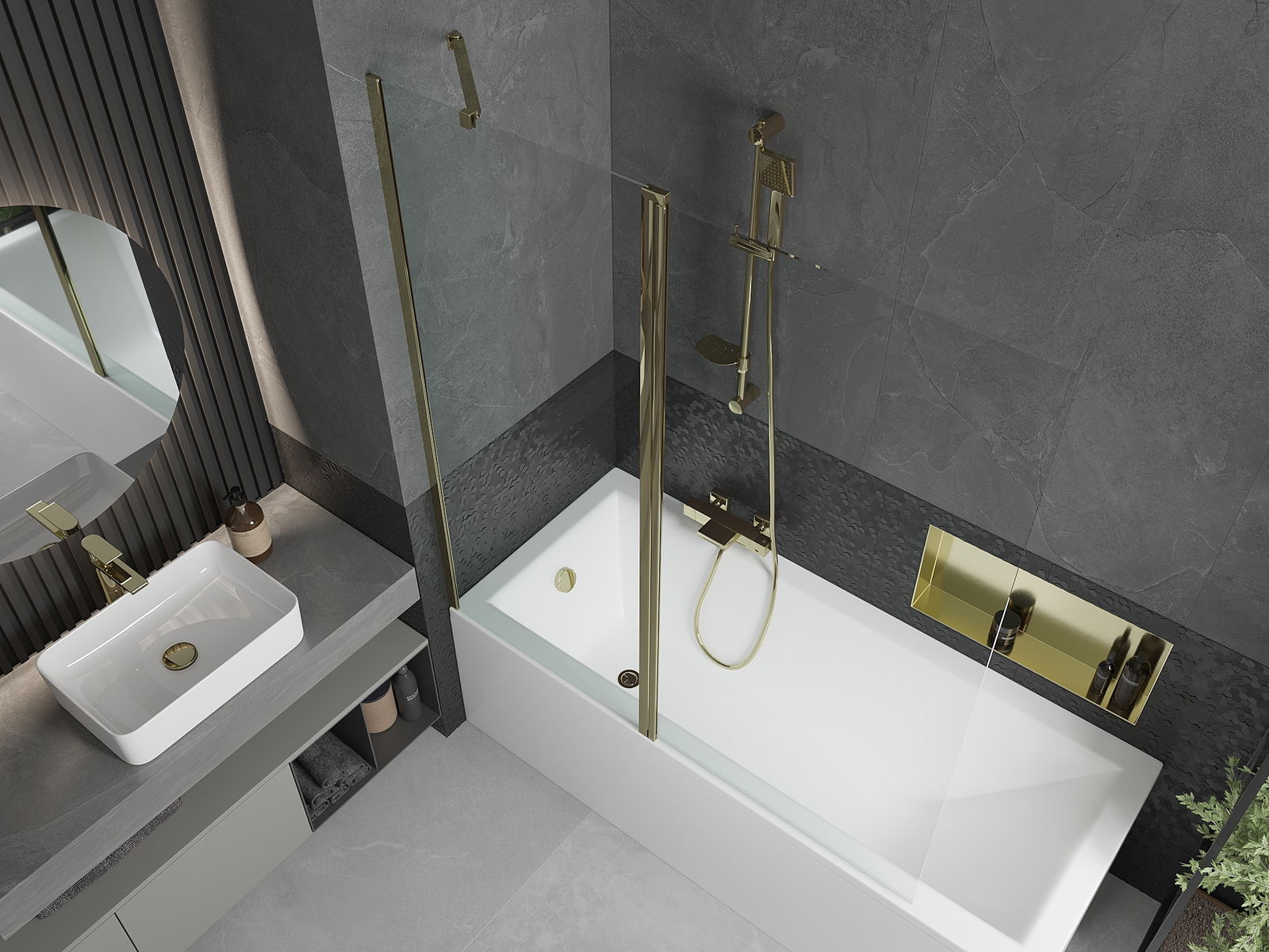 Dank dem universellen Montagesystem kann de Paravent je no Bedierfness op der rietser oder lénkser Säit montéiert ginn. Sou kanns de eng Dusch plangen, déi op de Raum vun der Buedzëmmer ugepasst ass.