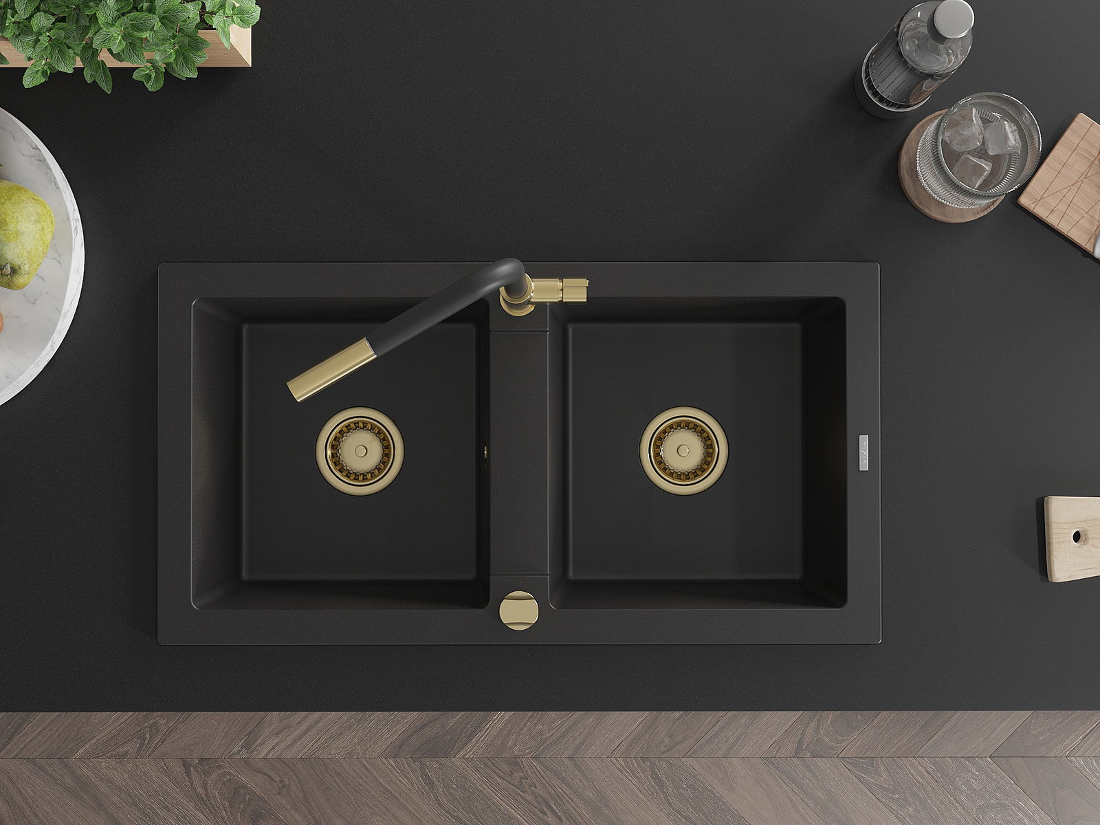 Mexen Mario Granit-Spullsteen mat 2 Becken mat Flora, schwaarz - 6504-77-670401-57-G