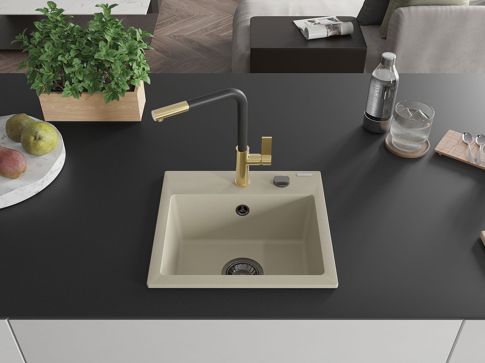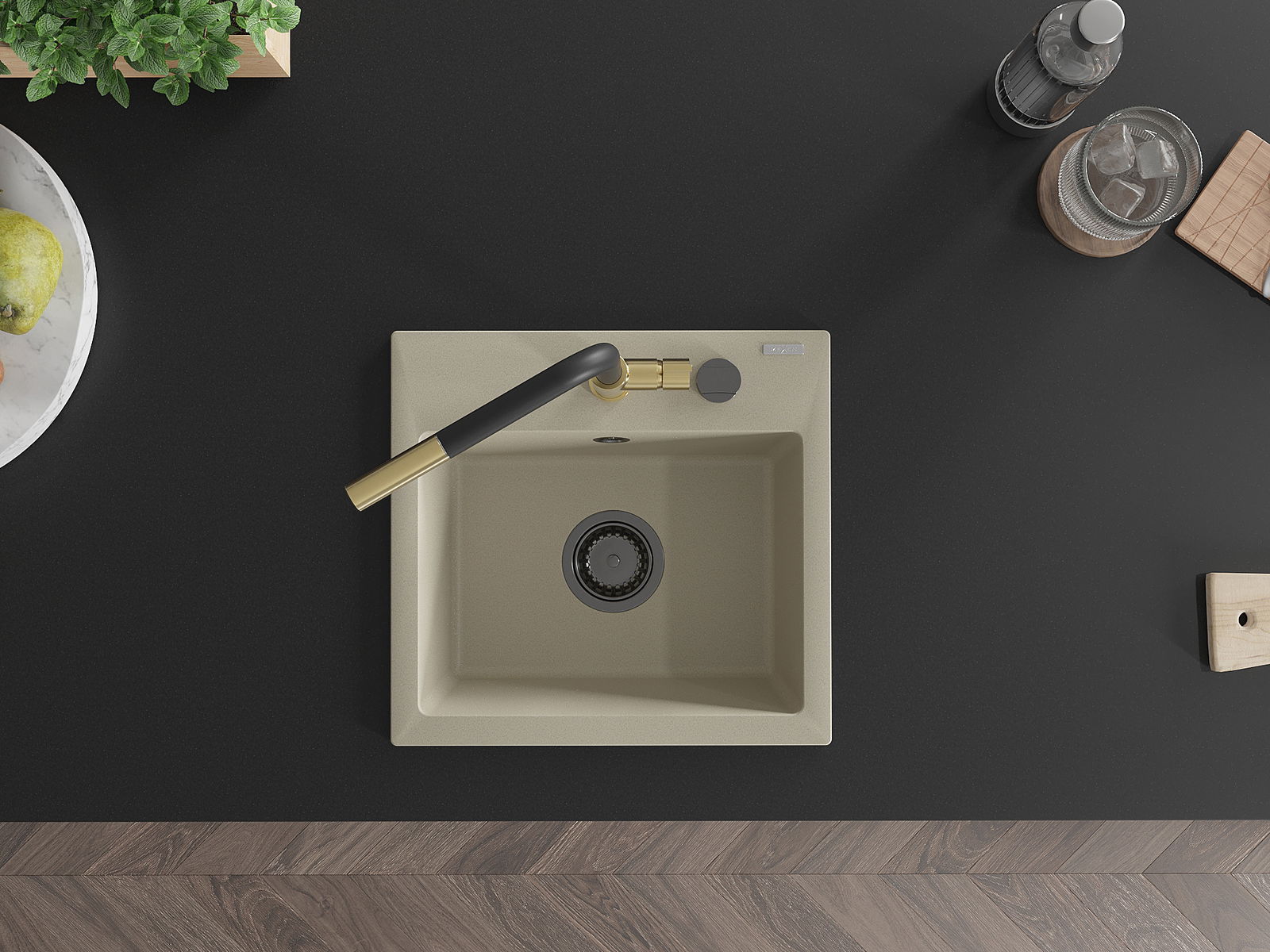 De Spullsteen huet e virgefraist Lach mat engem Duerchmiesser vu 35 mm fir selwer auszeschloen. Et kann ënner anerem genotzt ginn fir e Spender fir Flëssegkeet z'installéieren, deen d'Präsenz vu Plastikfläschen an der Kichen eliminéiert an hir en elegante Finish gëtt.