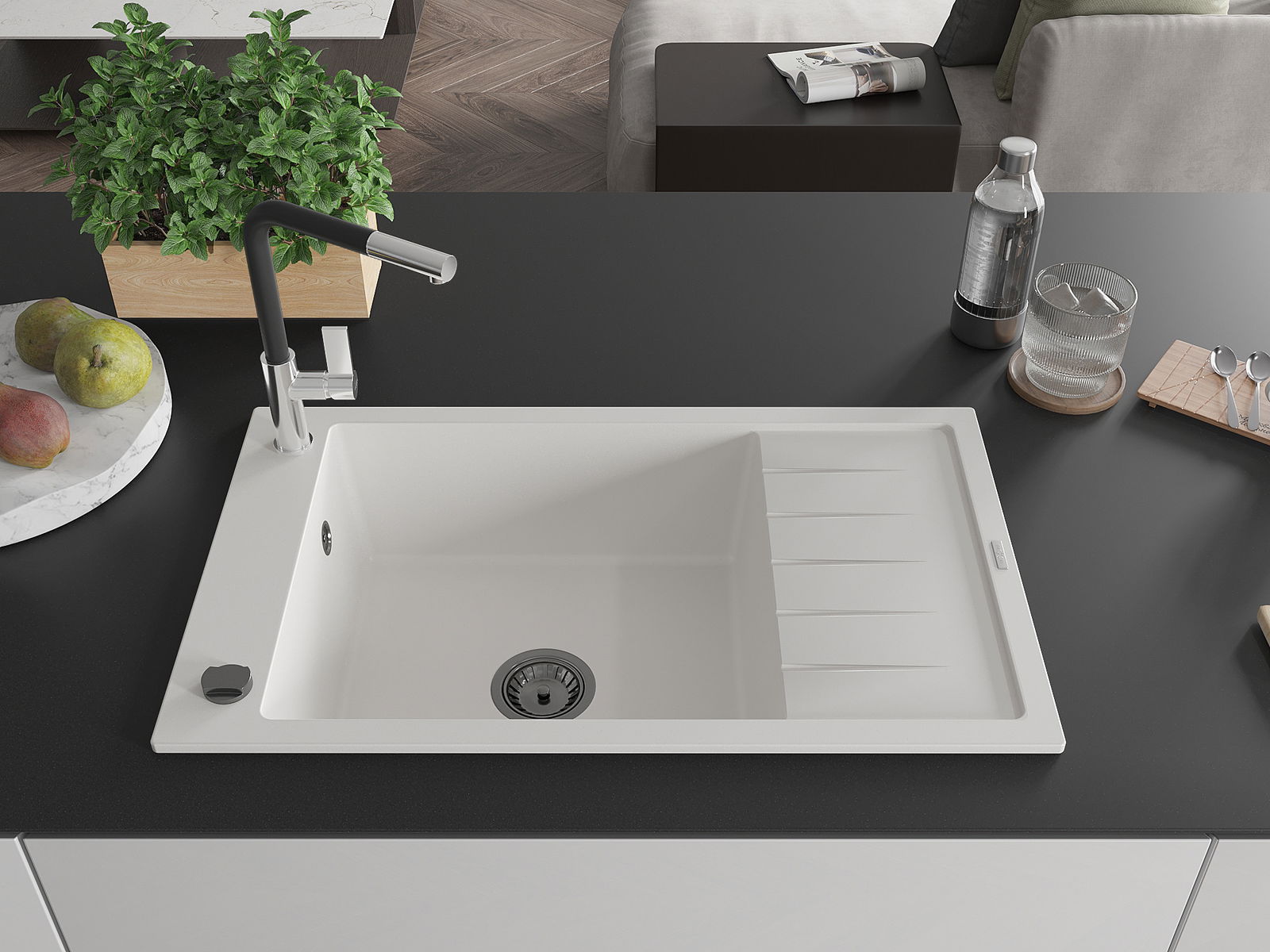 Mexen Elias Granit-Kichelenz-Set mat enger Spull a Krunn Flora, wäiss - 6511-20-670401-07-B