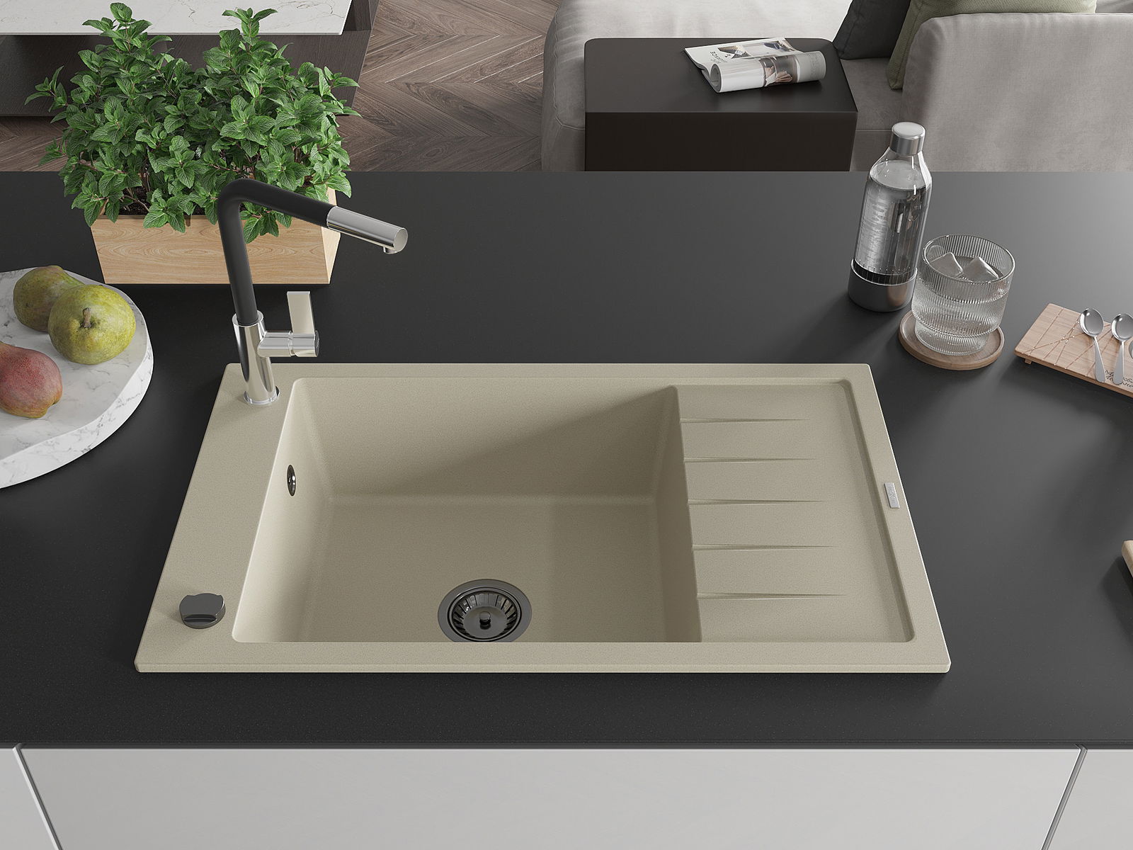 D'Uewerfläch vum Spullstee ass fleck- a verfärbungsresistent, wat se einfach ze botzen mécht an hir Faarf iwwer eng laang Zäit vum Gebrauch behalen léisst. Esthetesch an praktesch Ergänzung fir all Kichen.