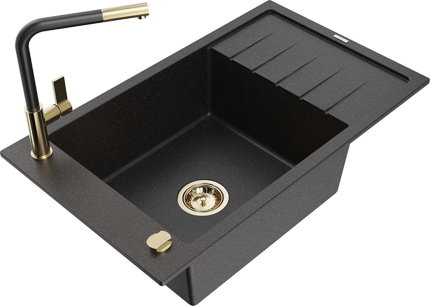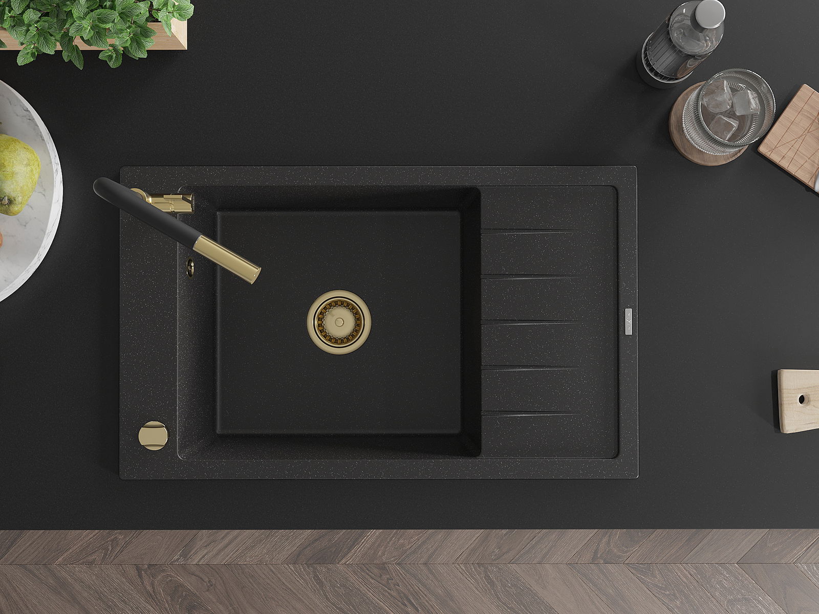 Mexen Elias Granit-Spullsteen mat enger Schoss mat Ofdrock an der Kichenbatterie Flora, schwaarz/sëlwermetallic