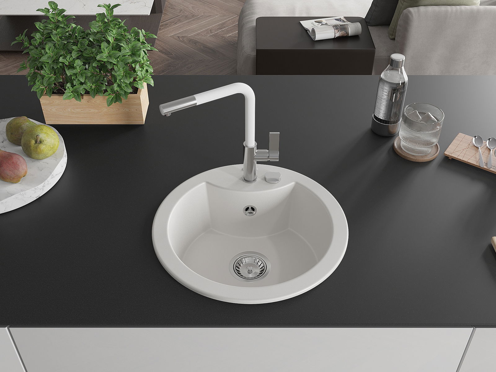 Den Ëmwäschbecken ass aus héichwäertege Granit gemaach. Et stellt eng elegant awer virun allem praktesch Ergänzung fir all Kichen duer, onofhängeg vun hirem Stil. Déi héich Qualitéit an Haltbarkeet vum Granit suergen fir méi järelaang Benotzung.