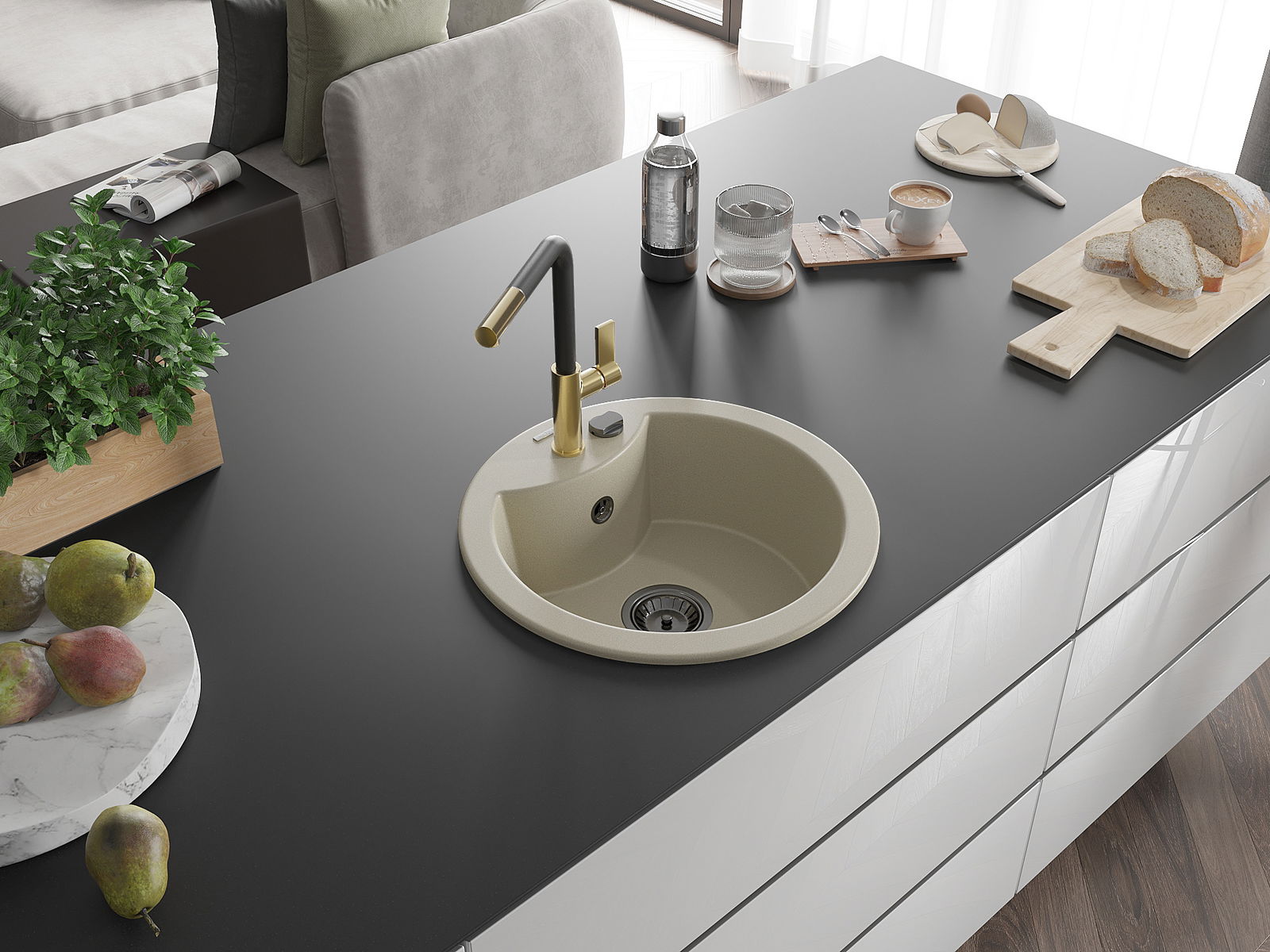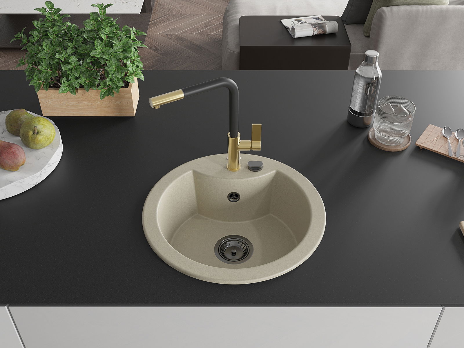 Den Ëmwäschbecken ass aus héichwäertege Granit gemaach. Et stellt eng elegant awer virun allem praktesch Ergänzung fir all Kichen duer, onofhängeg vun hirem Stil. Déi héich Qualitéit an Haltbarkeet vum Granit suergen fir méi järelaang Benotzung.
