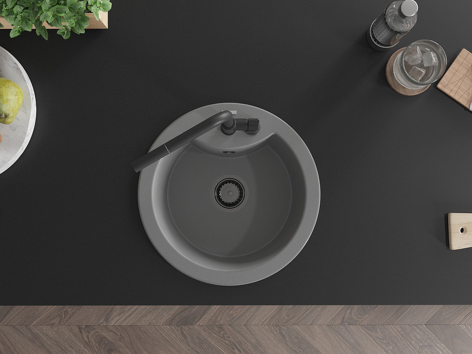 Den Ëmwäschbecken ass aus héichwäertege Granit gemaach. Et stellt eng elegant awer virun allem praktesch Ergänzung fir all Kichen duer, onofhängeg vun hirem Stil. Déi héich Qualitéit an Haltbarkeet vum Granit suergen fir méi järelaang Benotzung.