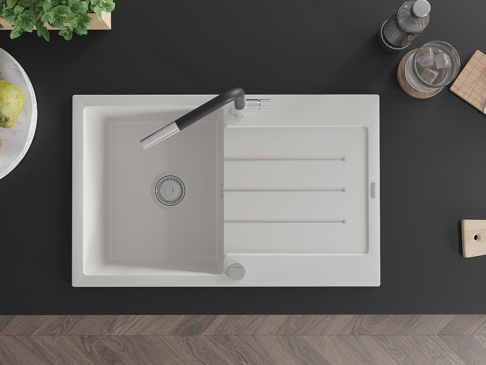 Mexen Bruno Granit-Eenzel-Spullsteen mat Drainage an Kichenkran Flora, wäiss - 6513-20-670401-07