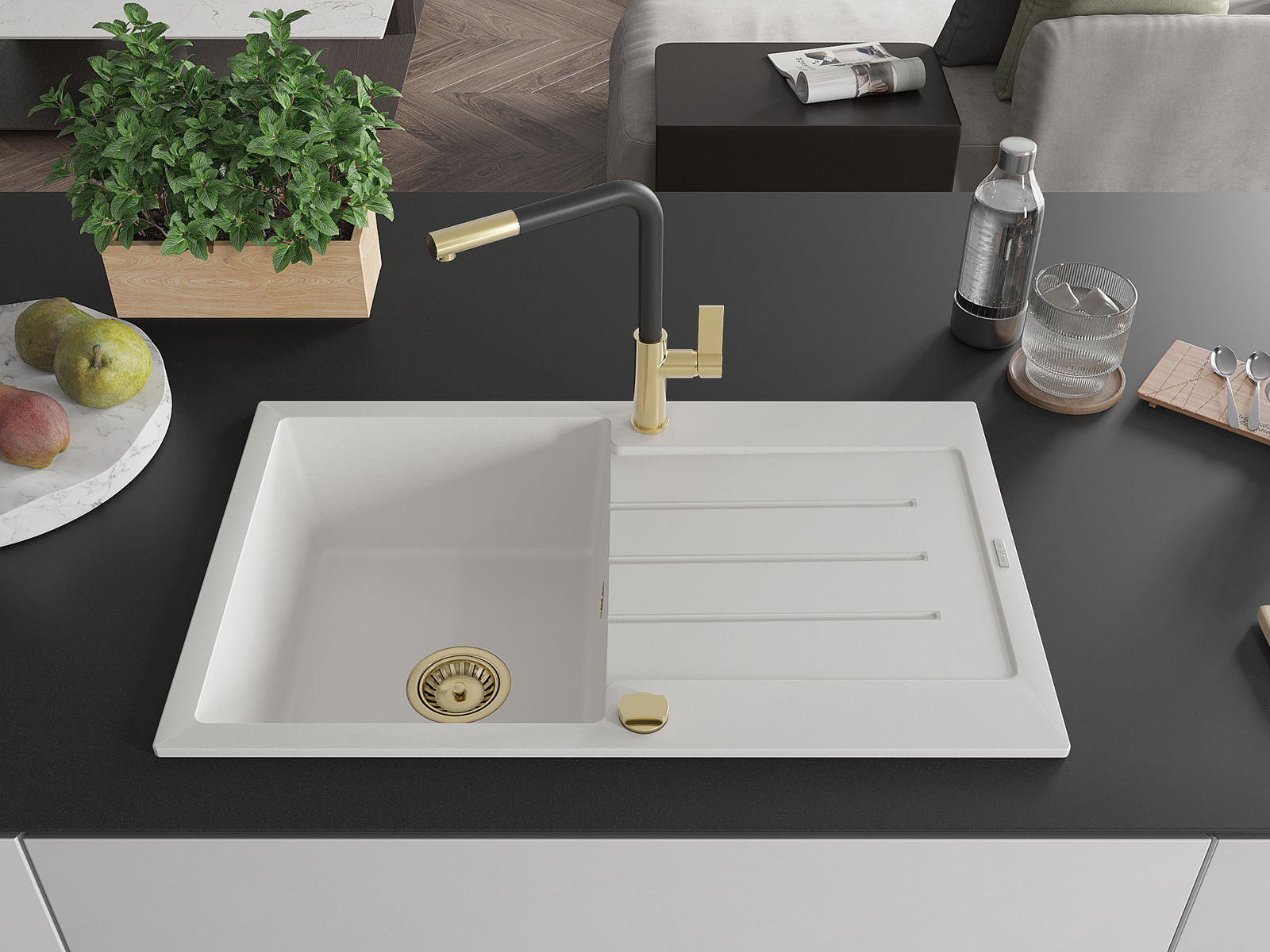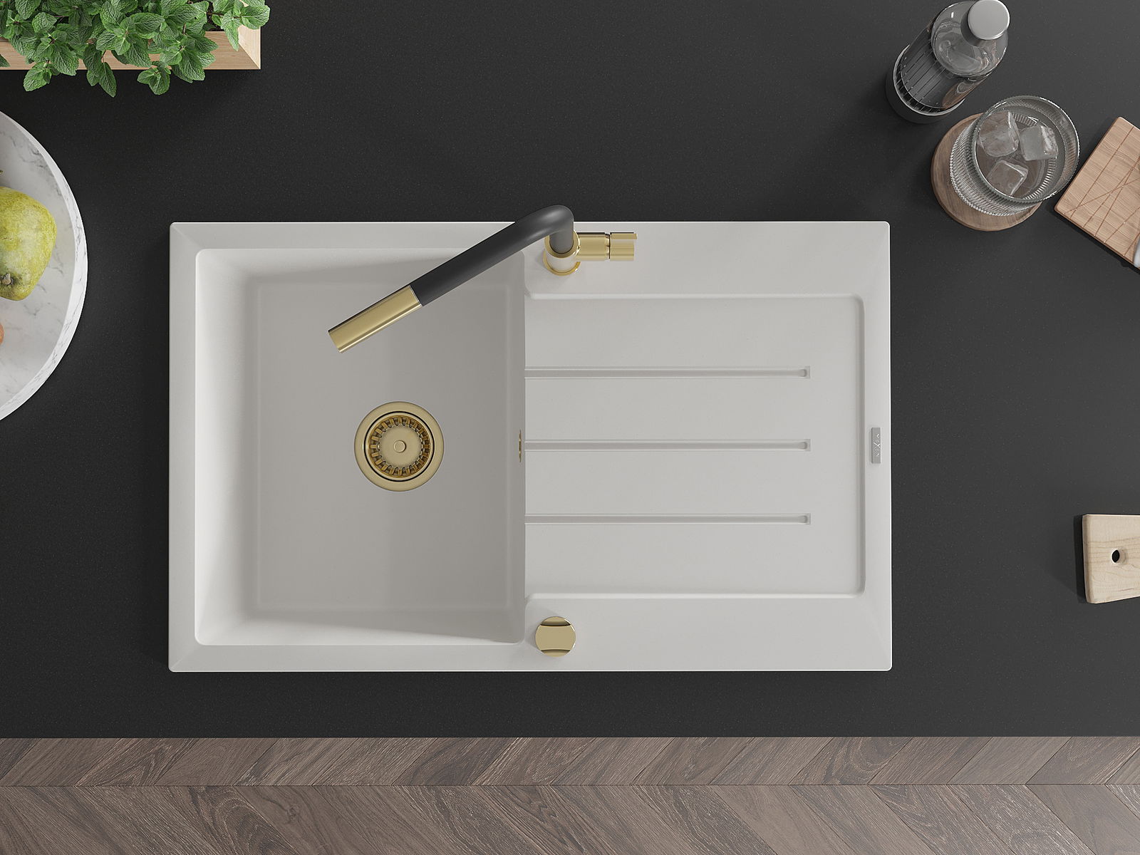 Mexen Bruno Granitspullut fir d'Kichen mat 1 Kummer, Drëppoflaach an Kichekraan Flora, wäiss - 6513-20-670401-57-G