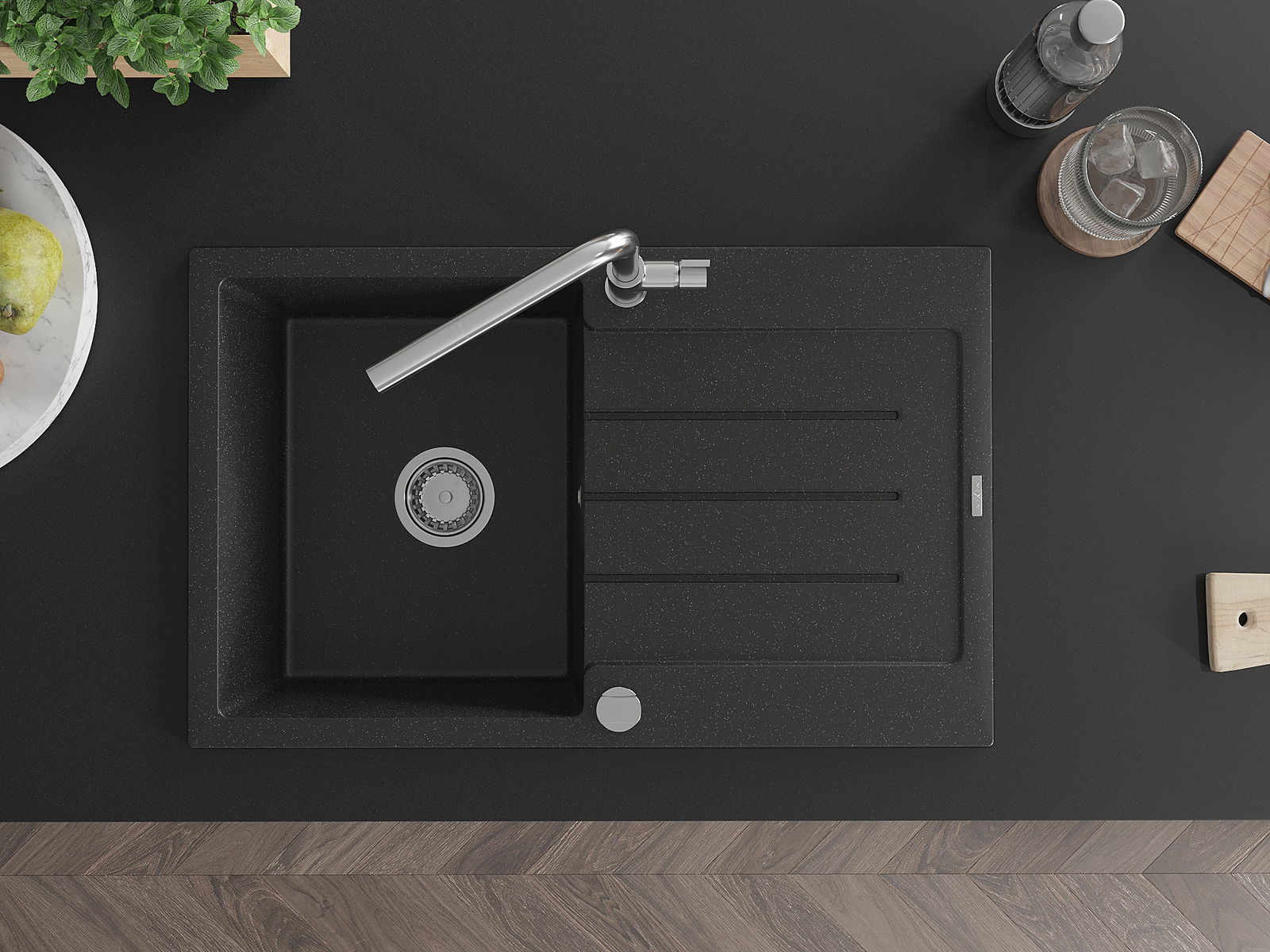 Mexen Bruno Granit-Évier matgréng 1-Schëffech mat Drainboard an Kichenkran Flora, schwaarz/sëlwermetallesch