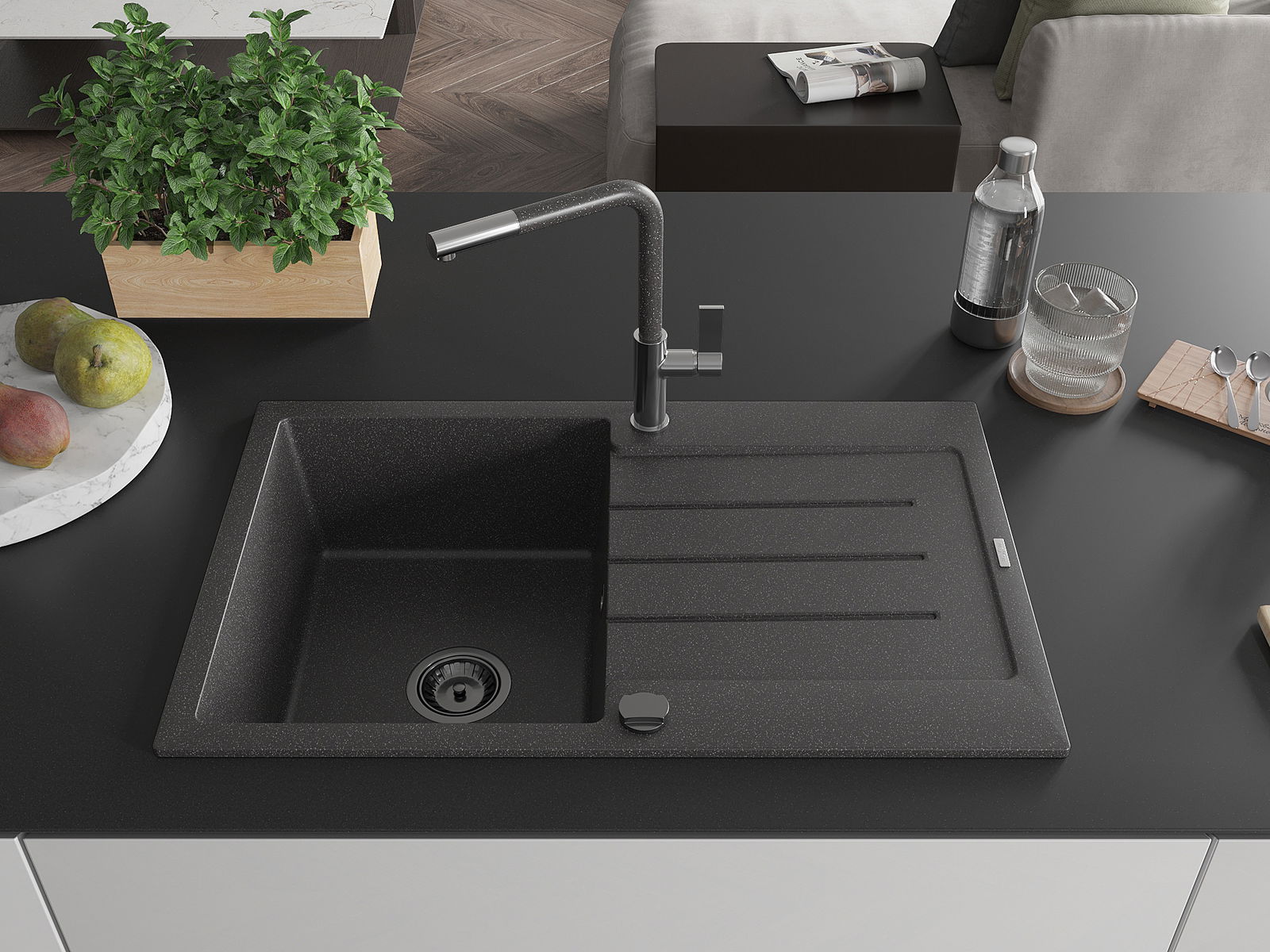 D'Uewerfläch vum Spullstee ass fleck- a verfärbungsresistent, wat se einfach ze botzen mécht an hir Faarf iwwer eng laang Zäit vum Gebrauch behalen léisst. Esthetesch an praktesch Ergänzung fir all Kichen.