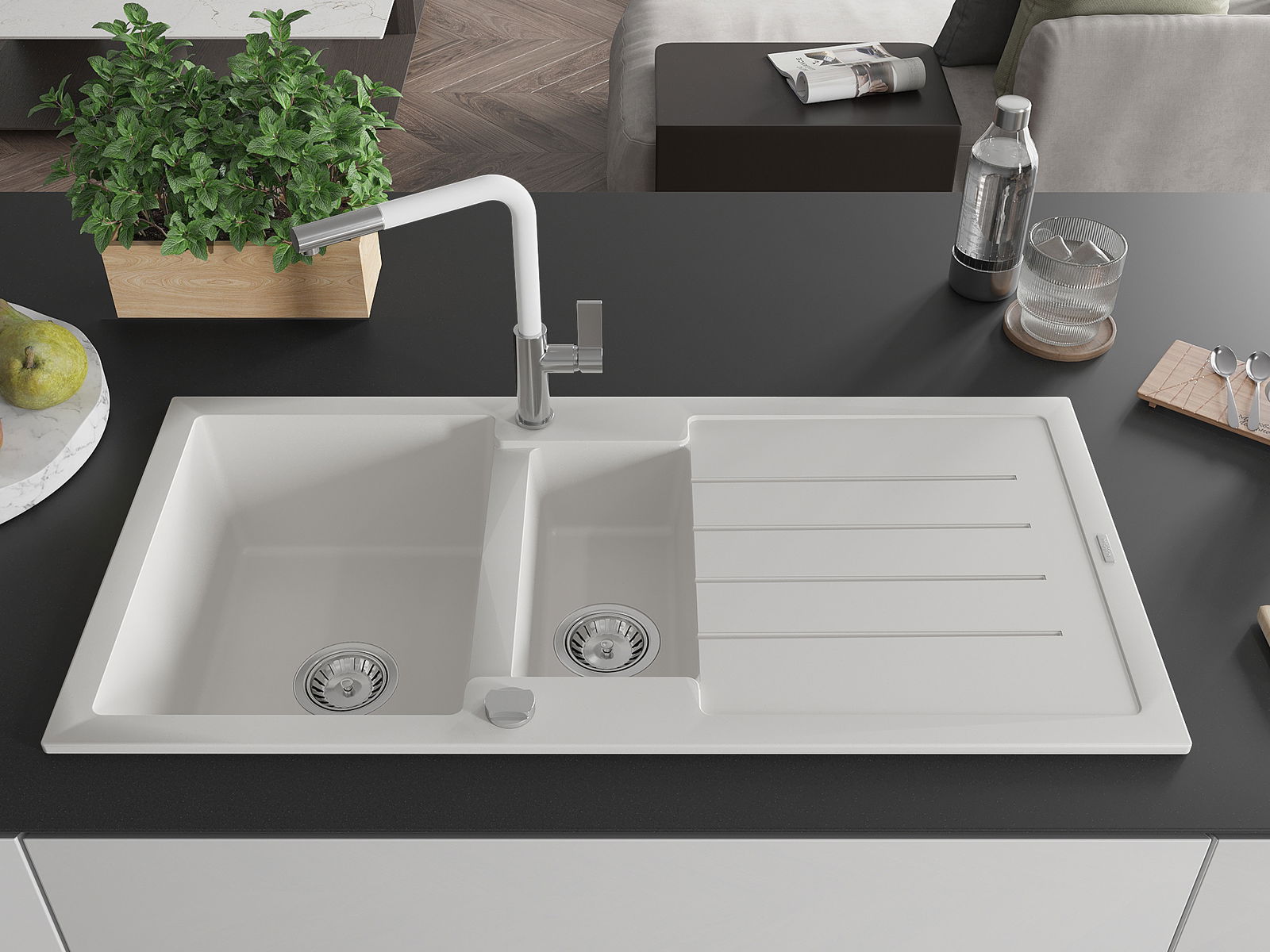 D'Uewerfläch vum Spullstee ass fleck- a verfärbungsresistent, wat se einfach ze botzen mécht an hir Faarf iwwer eng laang Zäit vum Gebrauch behalen léisst. Esthetesch an praktesch Ergänzung fir all Kichen.