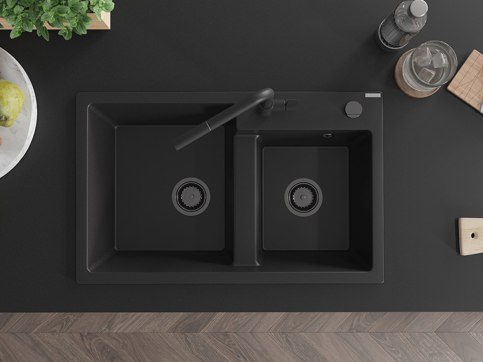 Mexen Tomas 2-Kammer-Granitt-Spullstee mat Kichekraan Flora, schwaarz - 6516-77-670401-70-B
