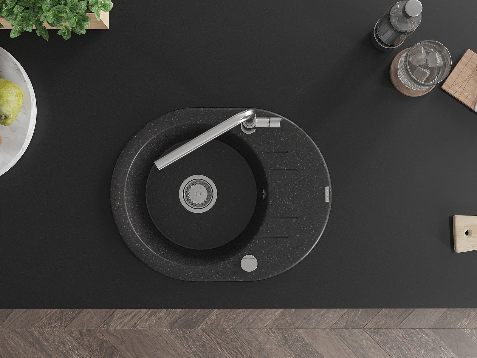 Den Ëmwäschbecken ass aus héichwäertege Granit gemaach. Et stellt eng elegant awer virun allem praktesch Ergänzung fir all Kichen duer, onofhängeg vun hirem Stil. Déi héich Qualitéit an Haltbarkeet vum Granit suergen fir méi järelaang Benotzung.