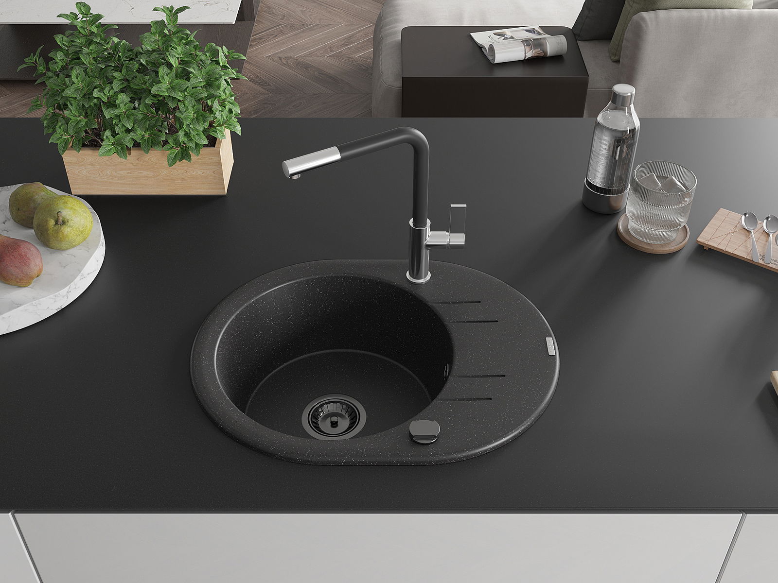 Den Ëmwäschbecken ass aus héichwäertege Granit gemaach. Et stellt eng elegant awer virun allem praktesch Ergänzung fir all Kichen duer, onofhängeg vun hirem Stil. Déi héich Qualitéit an Haltbarkeet vum Granit suergen fir méi järelaang Benotzung.