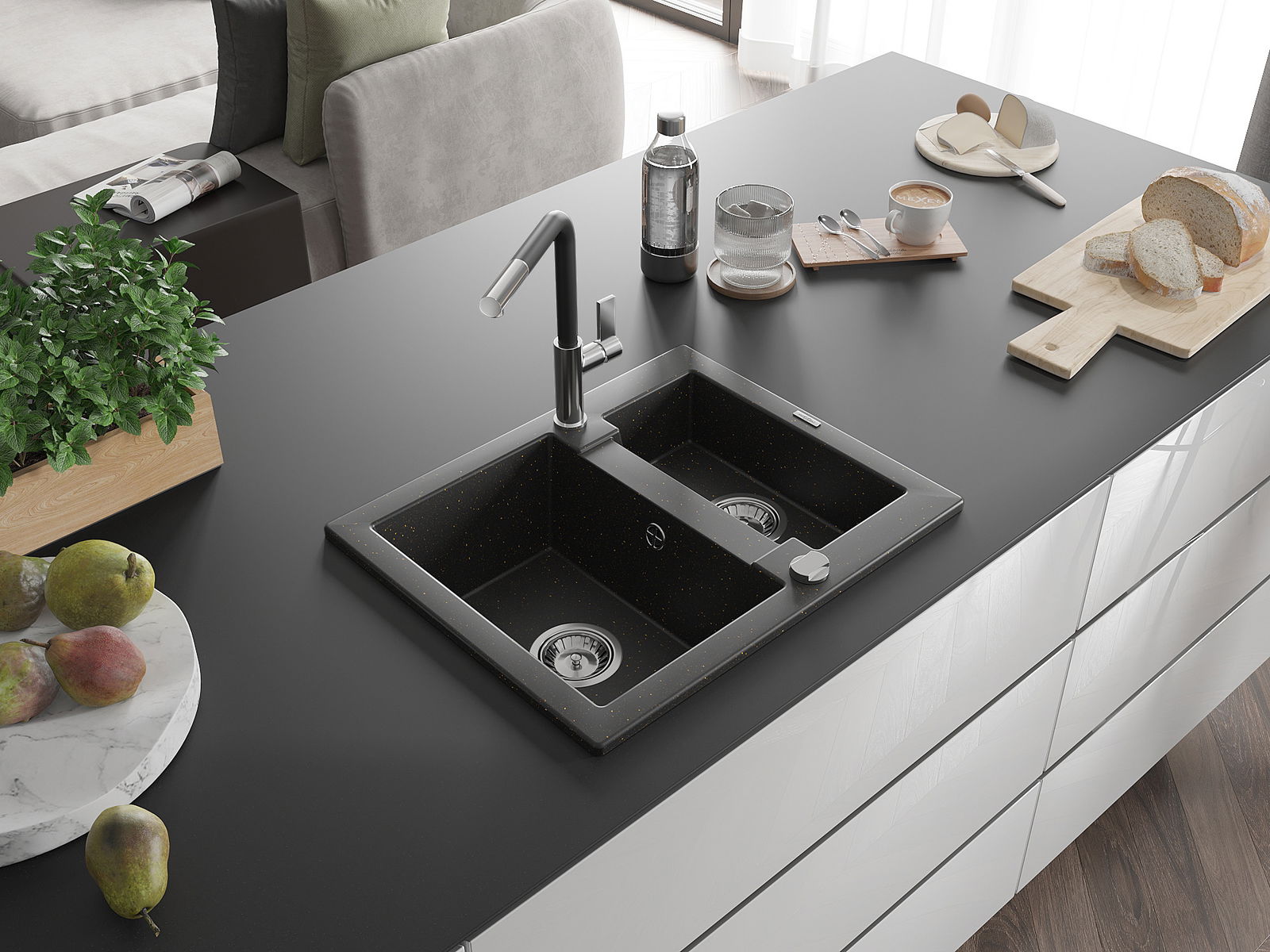 Den Ëmwäschbecken ass aus héichwäertege Granit gemaach. Et stellt eng elegant awer virun allem praktesch Ergänzung fir all Kichen duer, onofhängeg vun hirem Stil. Déi héich Qualitéit an Haltbarkeet vum Granit suergen fir méi järelaang Benotzung.